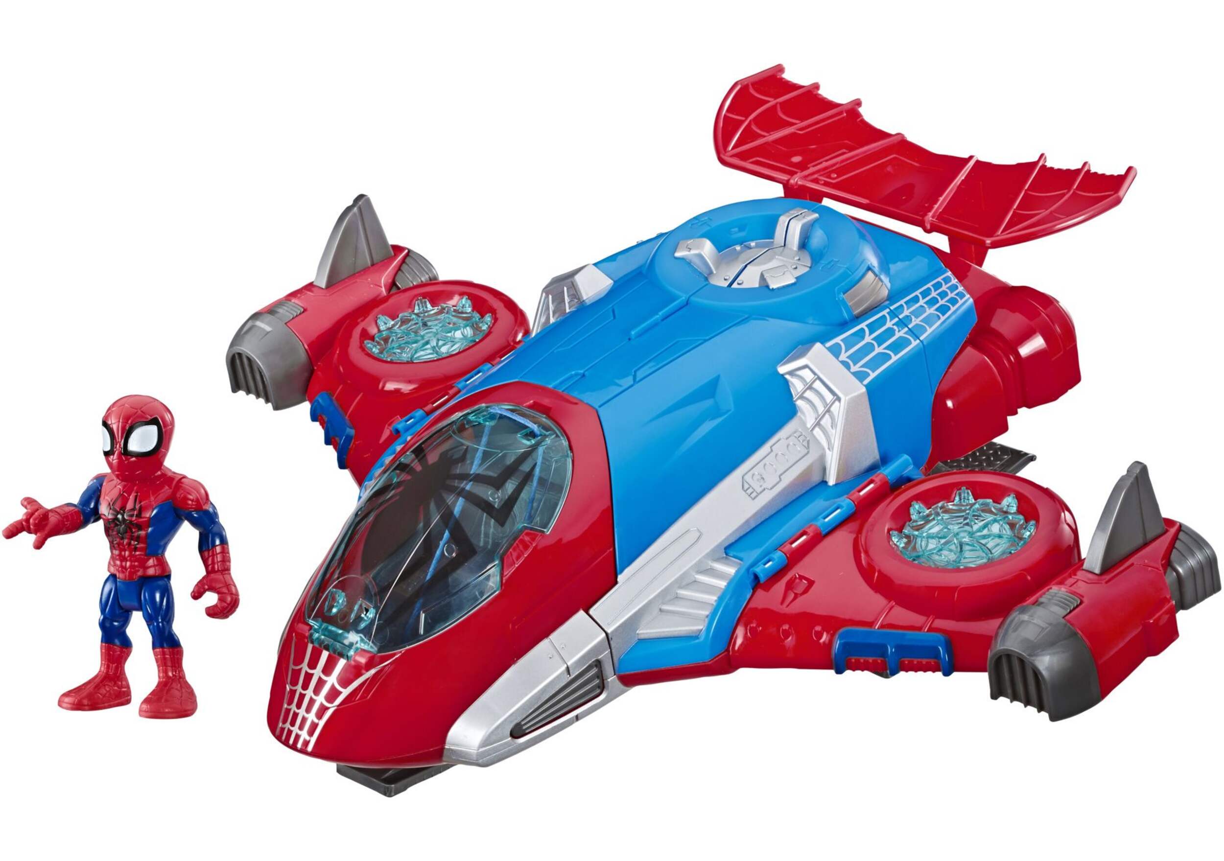 Figurine Spider-Man de 5 po qui se range dans le poste de pilotage d'un gros avion à réaction, ce qui ajoute au plaisir et à l'excitation d'imaginer des sauvetages audacieux