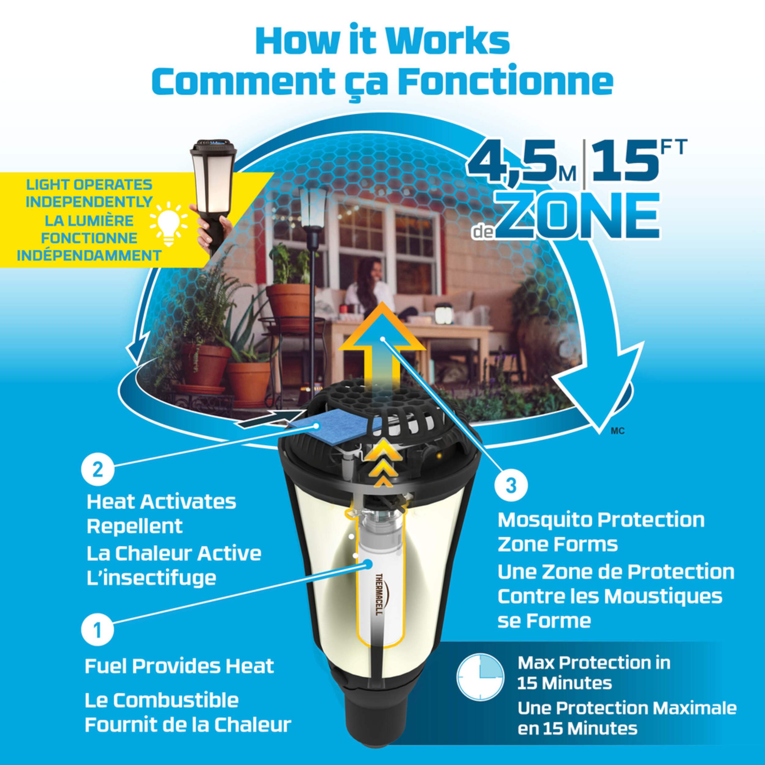 La torche chasse-moustiques Thermacell crée une zone de protection de 4,5 m (15 pi) contre les moustiques
