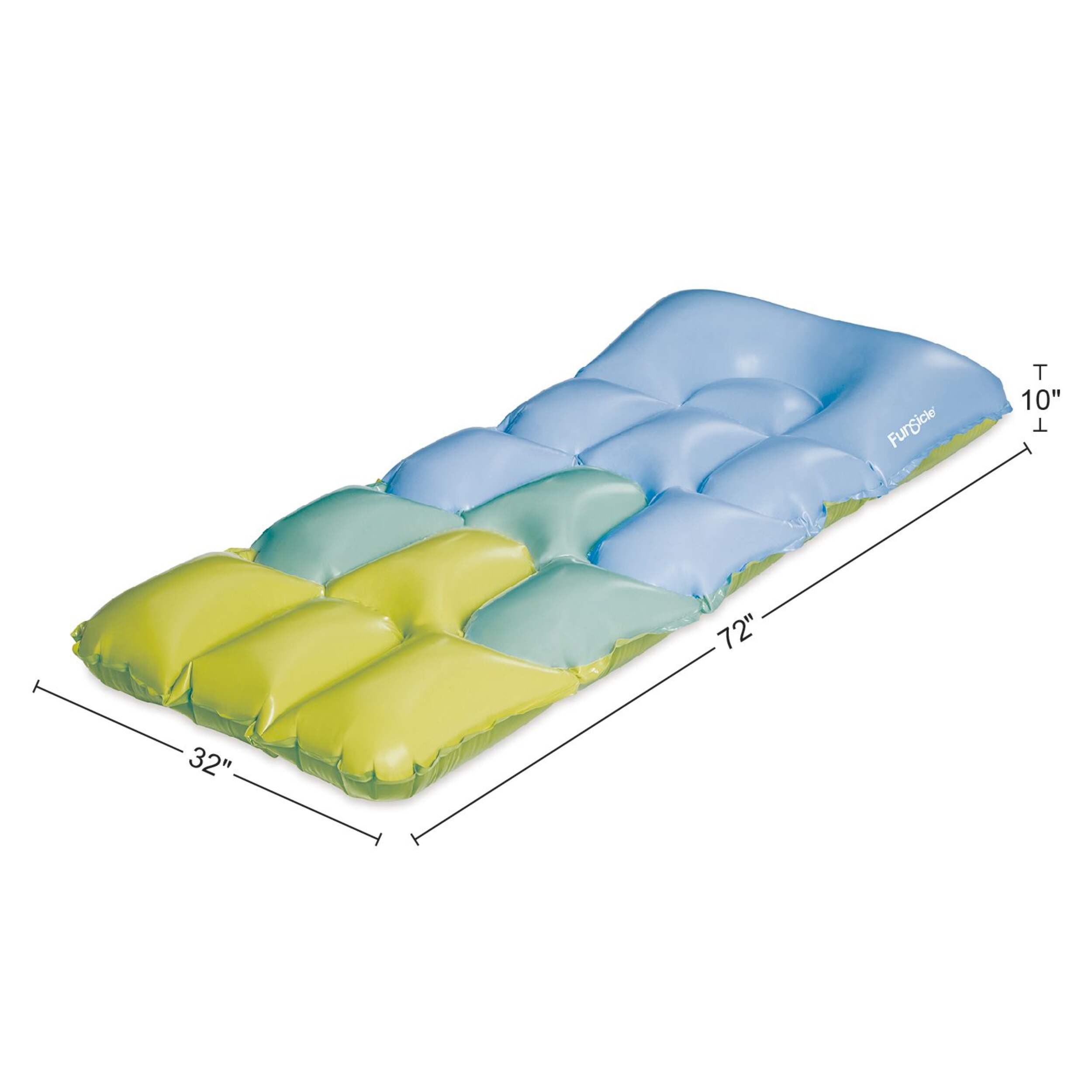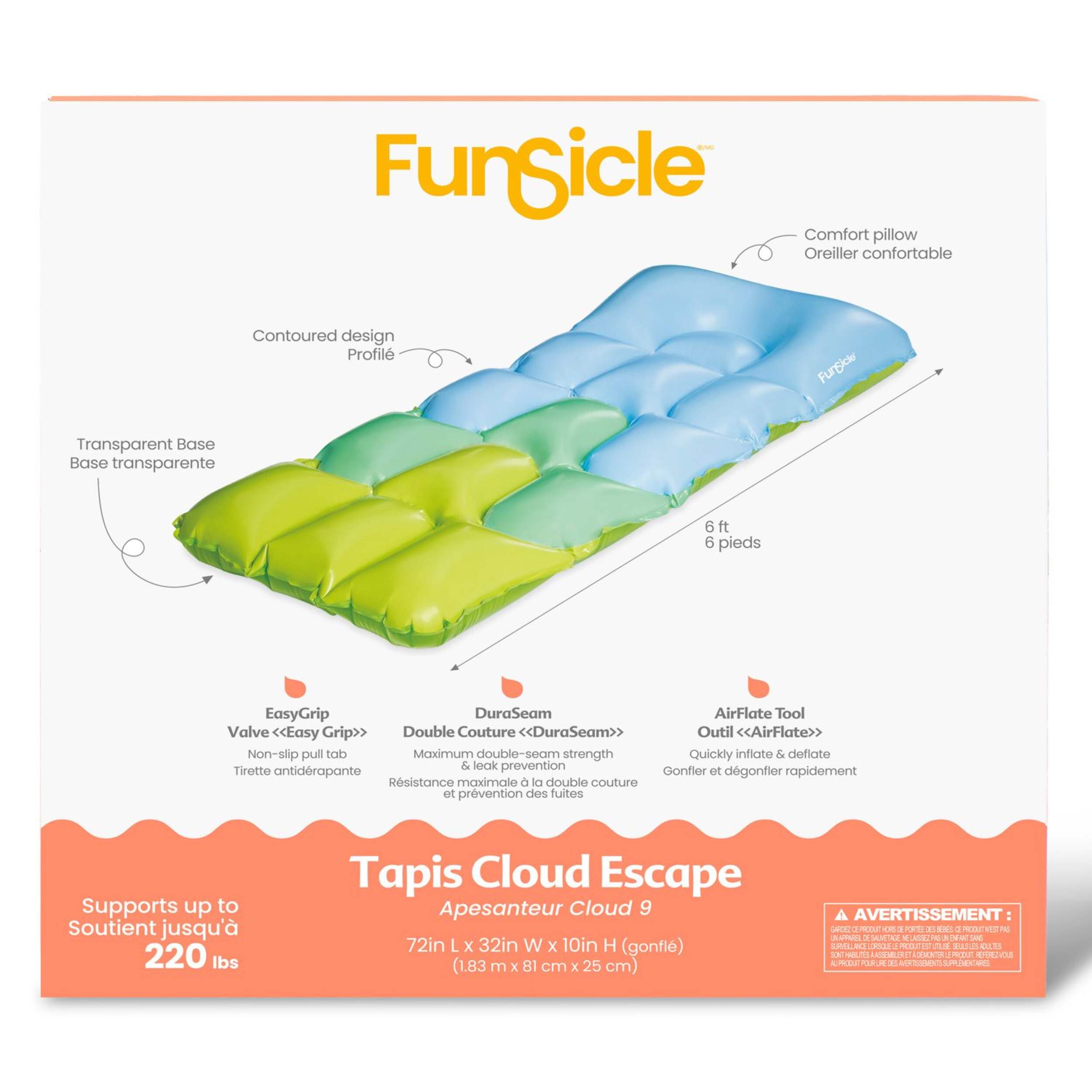 Dimensions (dégonflé) : 86 x 35 po, taille gonflée : 72 x 32 x10 po