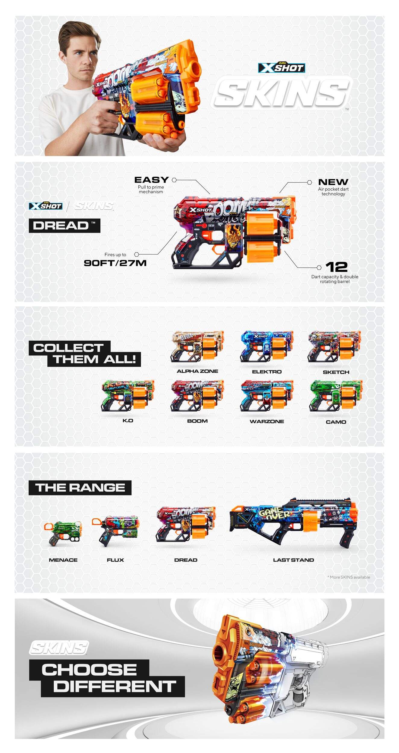 Foudroyeur Zuru X-Shot Skins Dread, 7 motifs uniques, capacité de 12 fléchettes, 8 ans et plus