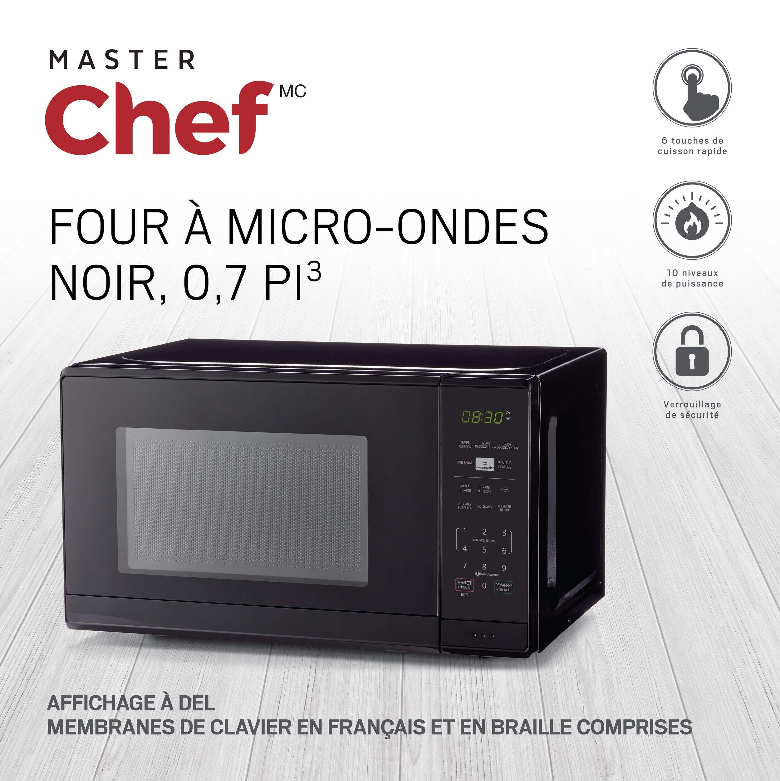 Doté de 10 niveaux de puissance et de 6 options de cuisson préprogrammées à une touche pour le maïs soufflé, la pizza, les pommes de terre au four et plus encore