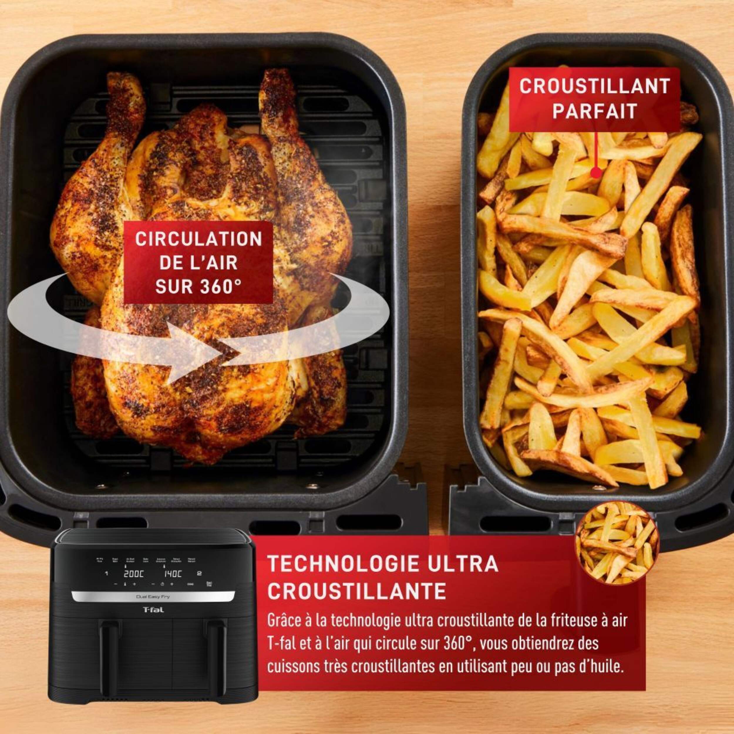 CROUSTILLANT PERFECTIONNÉ : Grâce à la technologie de friture très croustillante T-fal et à la circulation d'air sur 360°, obtenez des résultats croustillants avec peu d'huile, soit jusqu'à 99 % moins de gras ajouté.* *Cuisson de 1 kg de frites fraîches avec 15 mL par rapport à la friture traditionnelle de 2 L.