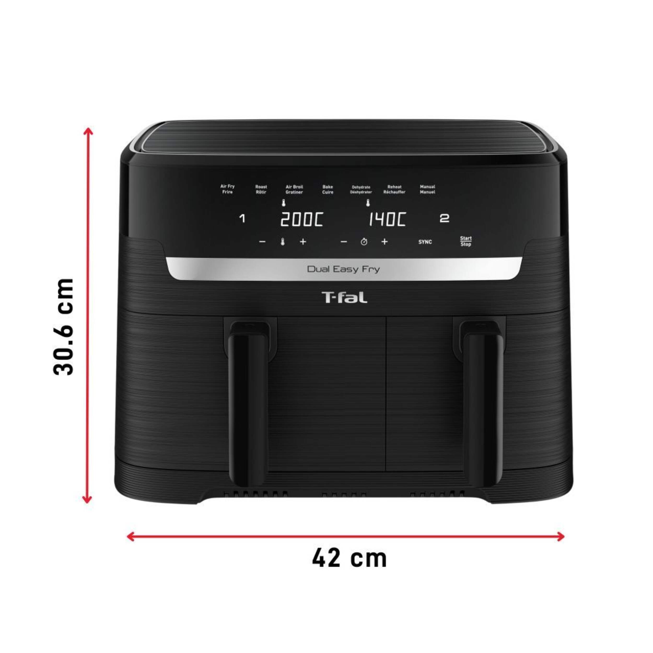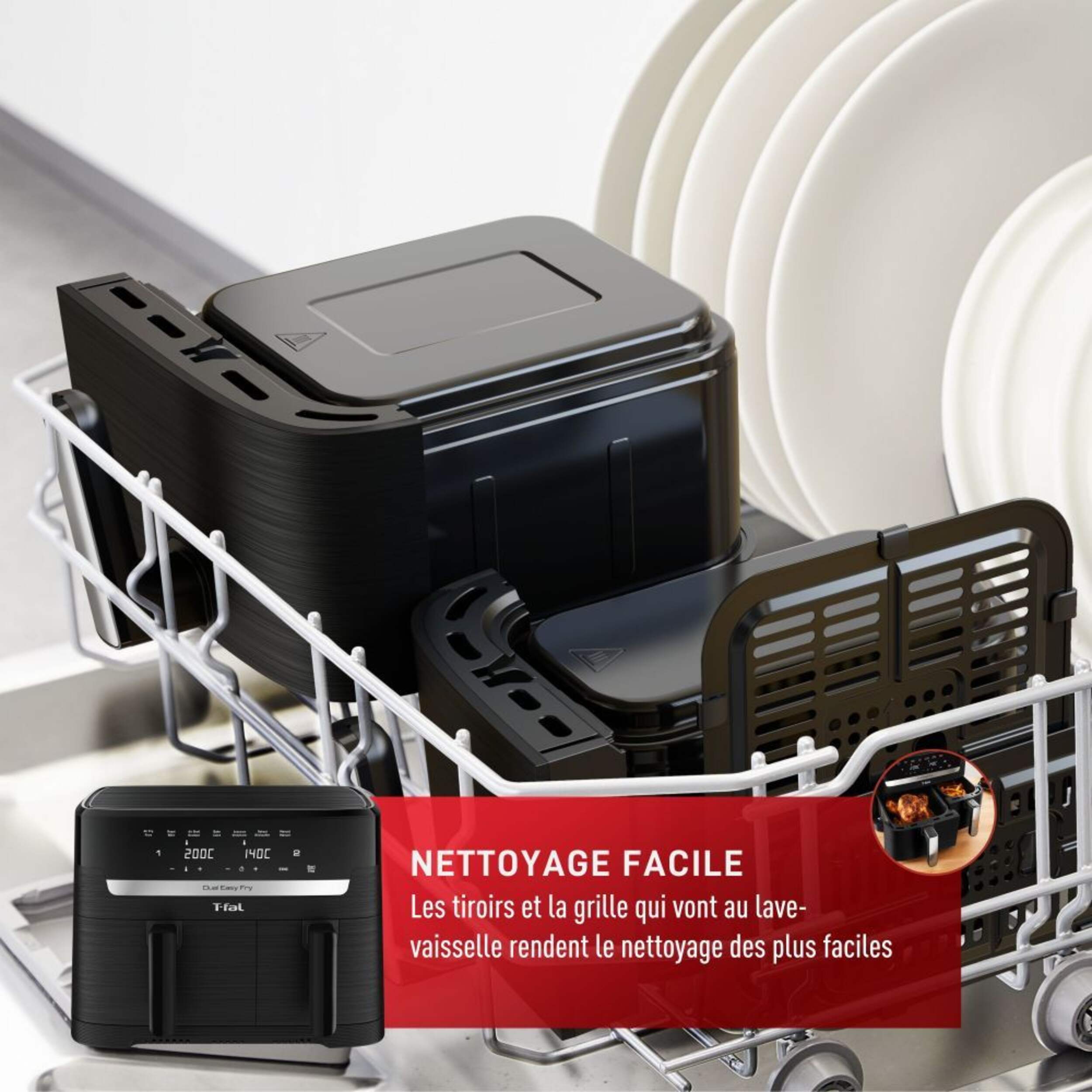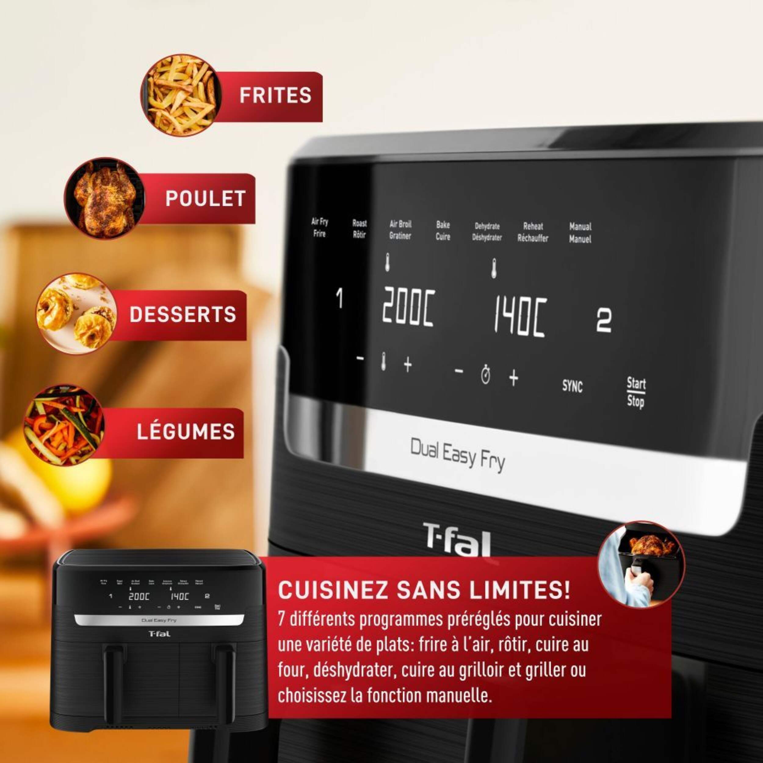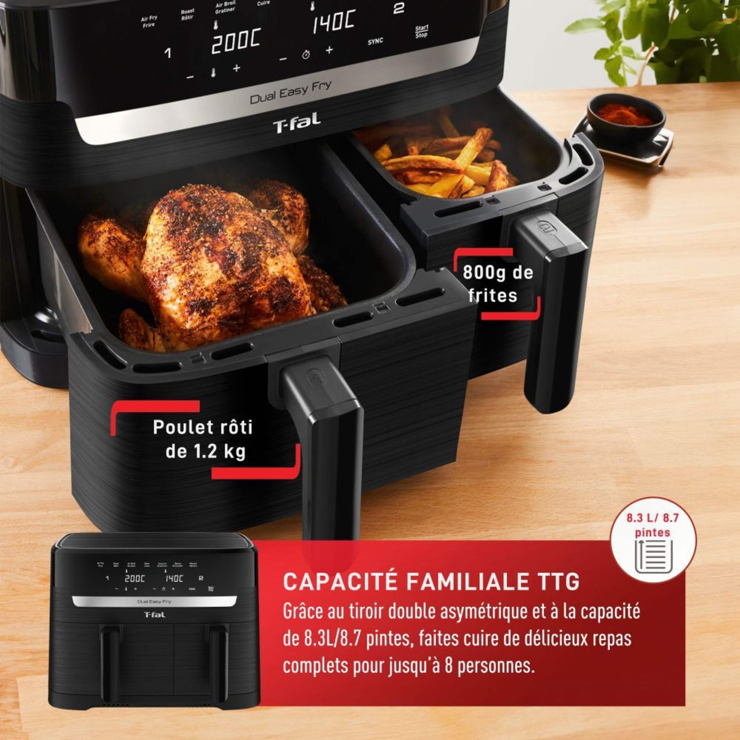 Voici la friteuse à air à deux zones Easy Fry : votre appareil de cuisine polyvalent! Avec une grande capacité de 8,3 L, faites cuire facilement des rôtis pour toute la famille ou des repas individuels. Utilisez le mode synchronisé afin de faire cuire deux aliments différents en même temps. Découvrez les 7 préréglages de cuisson pour faire cuire des repas délicieux rapidement. Voulez-vous des frites parfaitement croustillantes? La circulation d'air sur 360° et la technologie de friture très croustillante produisent des frites dorées parfaites. Le nettoyage est très simple grâce aux tiroirs et à la grille allant au lave-vaisselle. Inspirez-vous à l'aide de notre appli de recettes afin de créer plusieurs mets différents et améliorez votre expérience de cuisson!