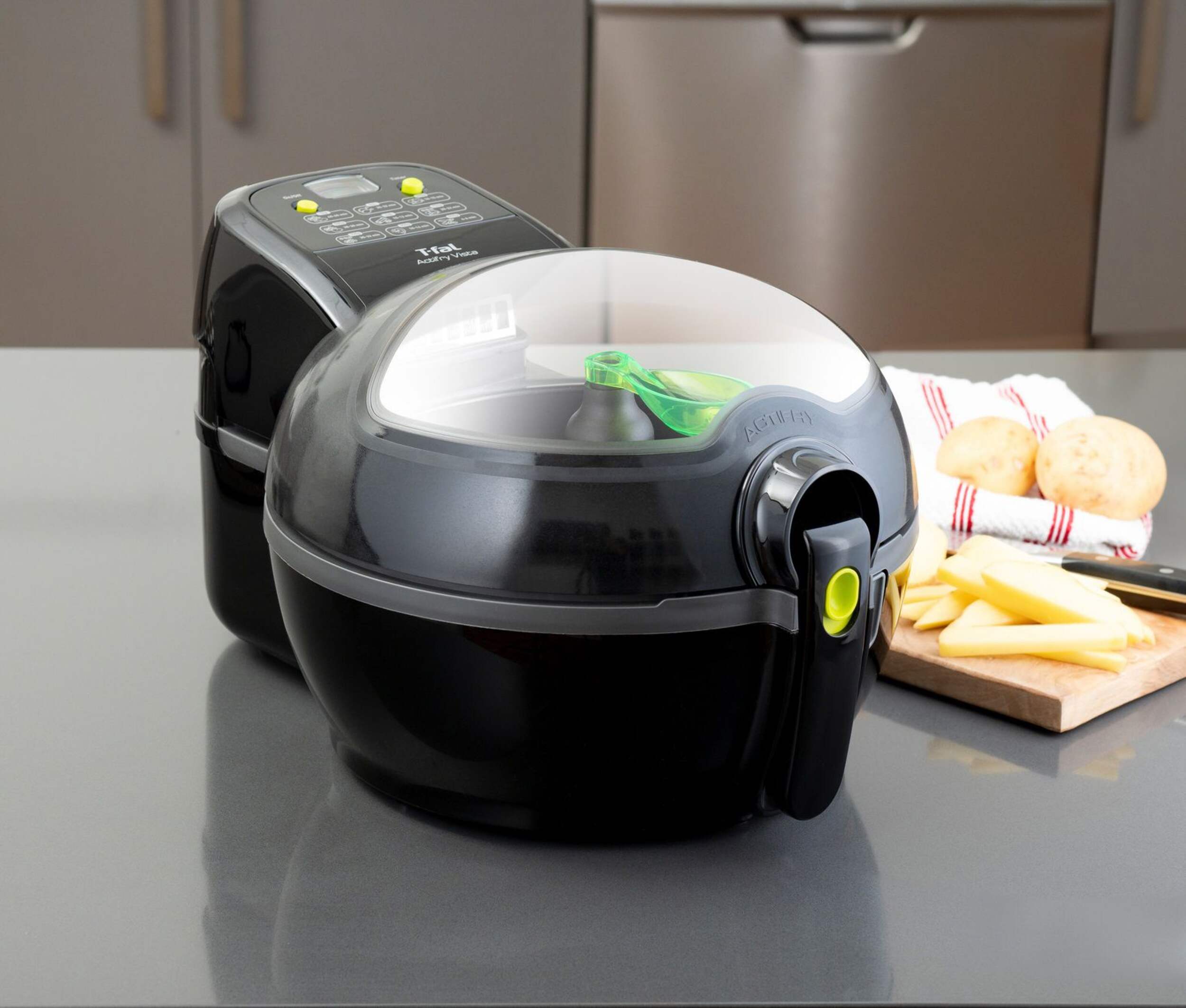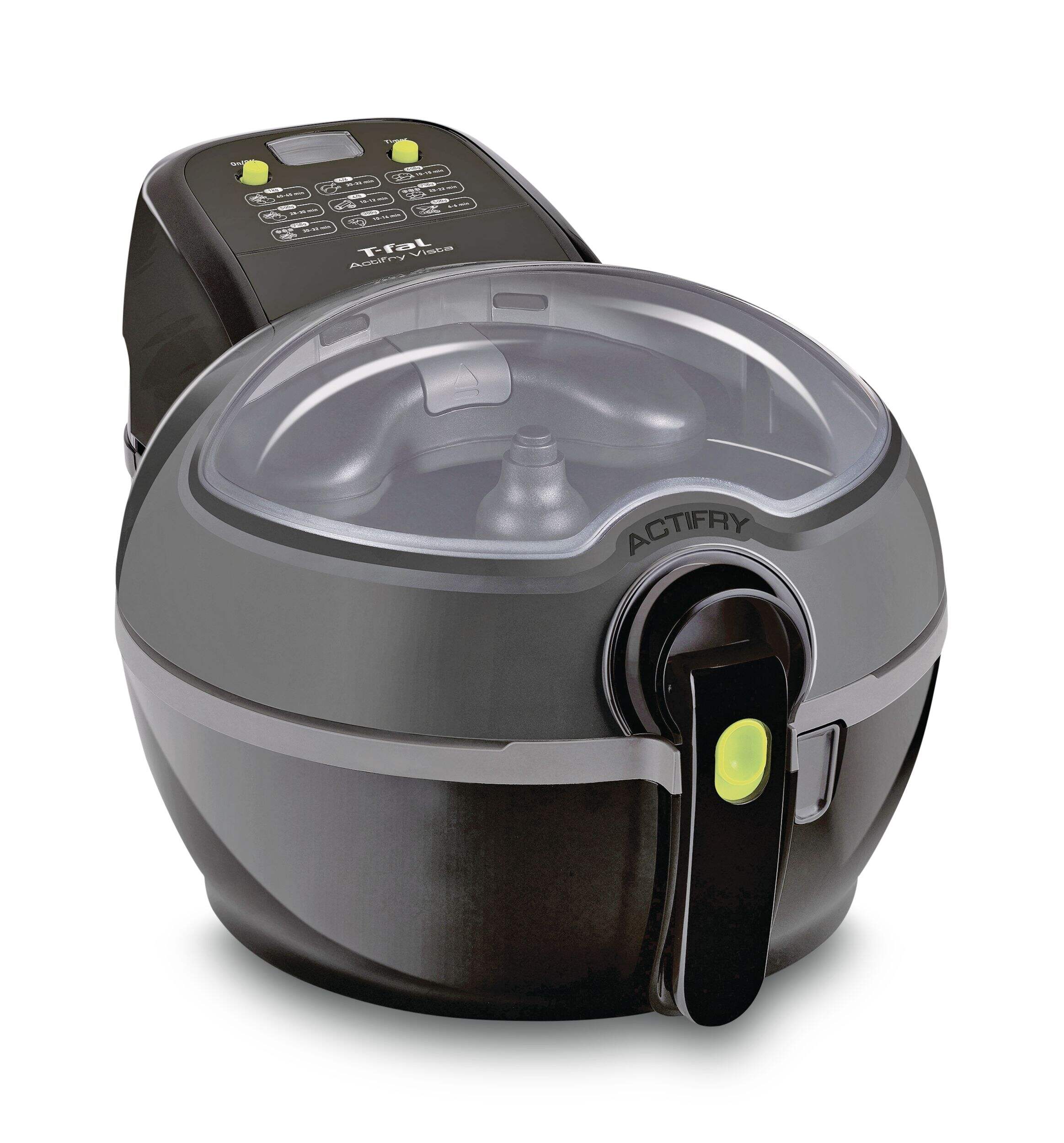 Friteuse T-fal Vista ActiFry avec technologie Dual Motion combinant l'air chaud avec une pale de brassage automatique afin de faire cuire les aliments uniformément en utilisant moins d'huile