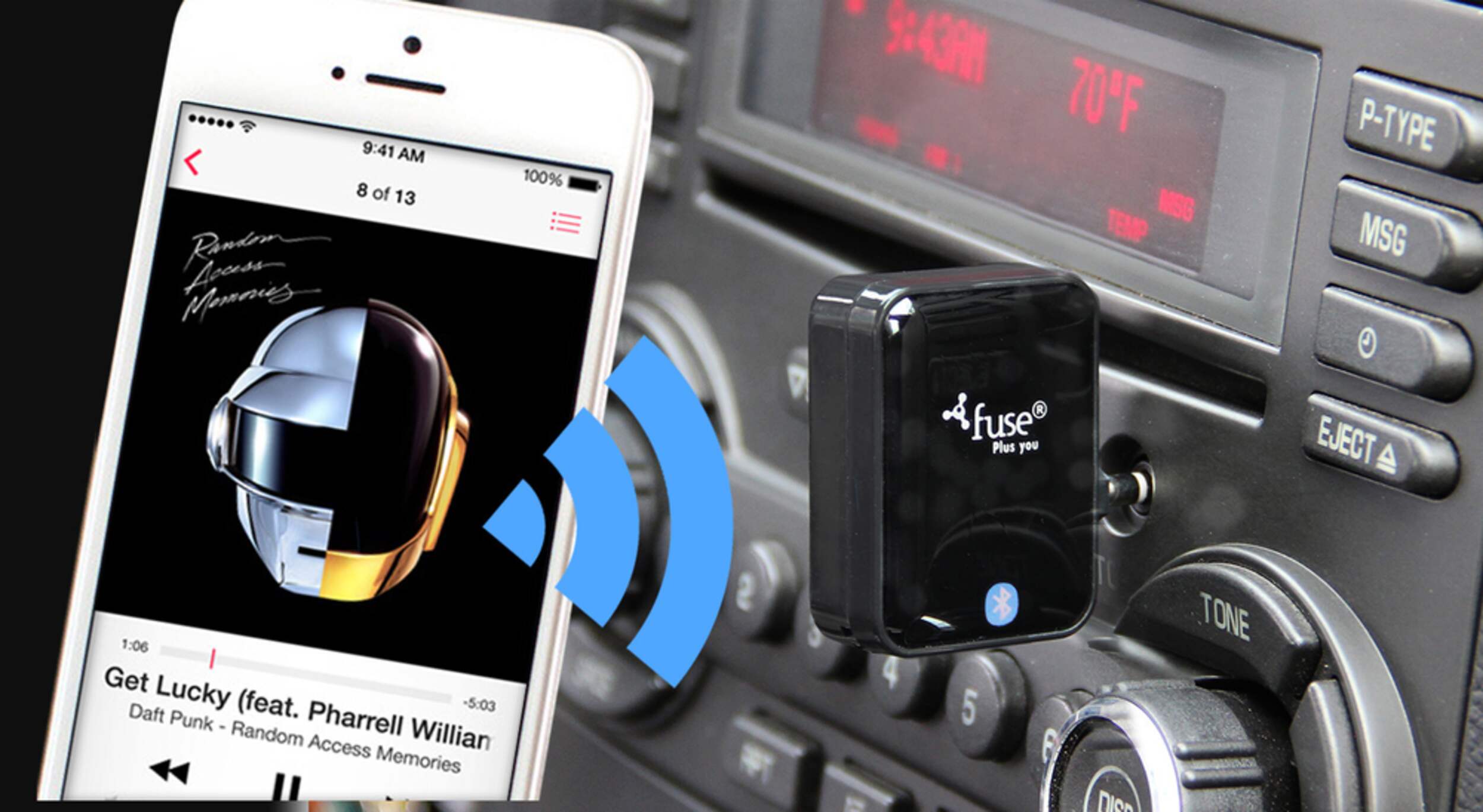 Branchez le récepteur de musique Fuse Bluetooth dans toute entrée auxiliaire stéréo pour faire jouer de la musique ou effectuer des appels mains libres par Bluetooth.