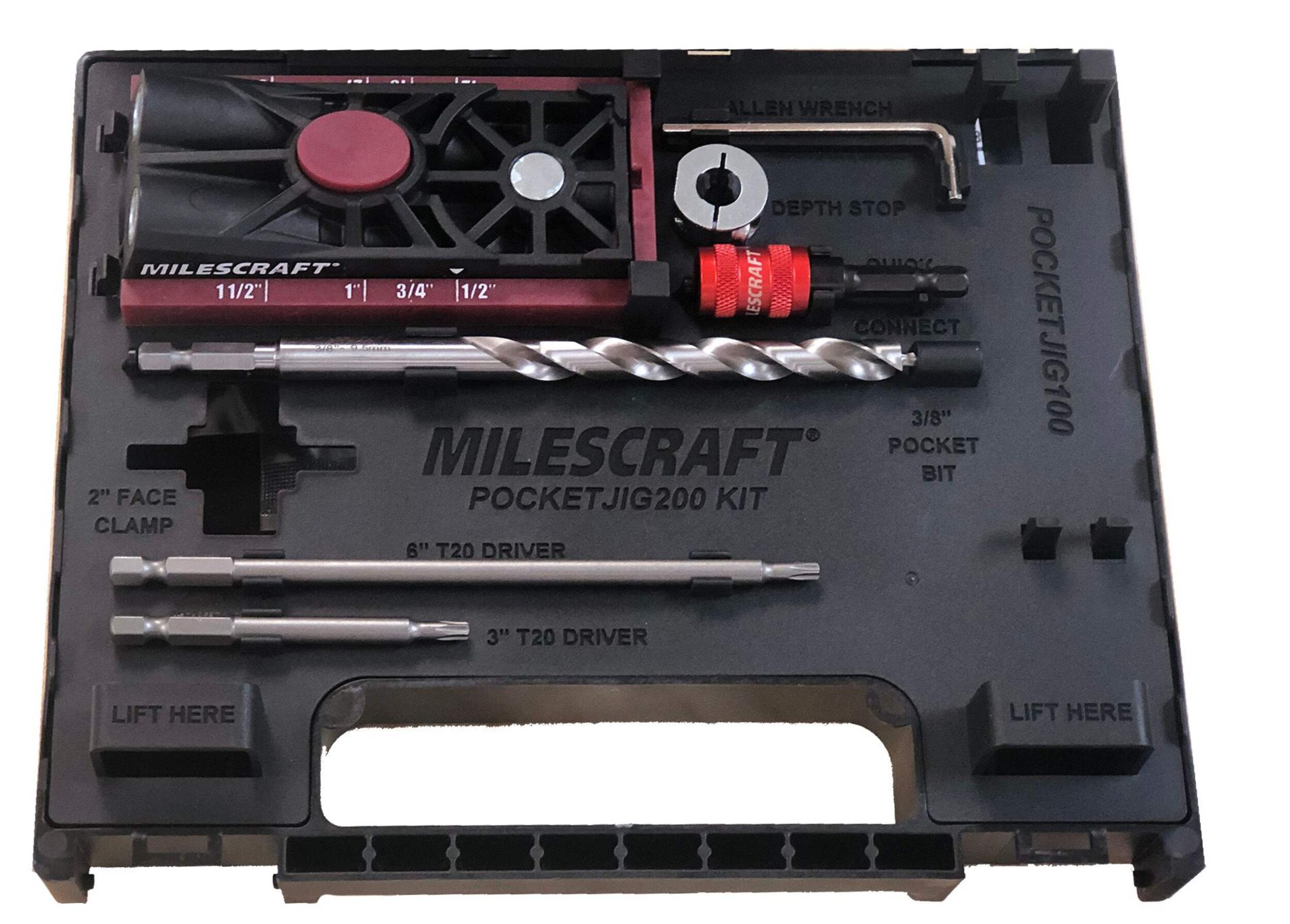 Le MilescraftMD PocketJig200MC vous permet d'assembler vos pièces rapidement avec des joints de trous de poche solides et précis. Créez des joints d'angle, des joints de bord, des joints en T, des joints d'encadrement, des joints d'onglet et effectuez des réparations. Avec des réglages intégrés pour différentes épaisseurs de planches, il suffit de régler ce gabarit de poche sur le réglage souhaité, de régler la profondeur de votre mèche et de commencer à percer. Ce kit complet dans une mallette de transport robuste comprend tous les embouts, les tournevis, les vis et les accessoires nécessaires pour réaliser n'importe quel projet de trou de poche.