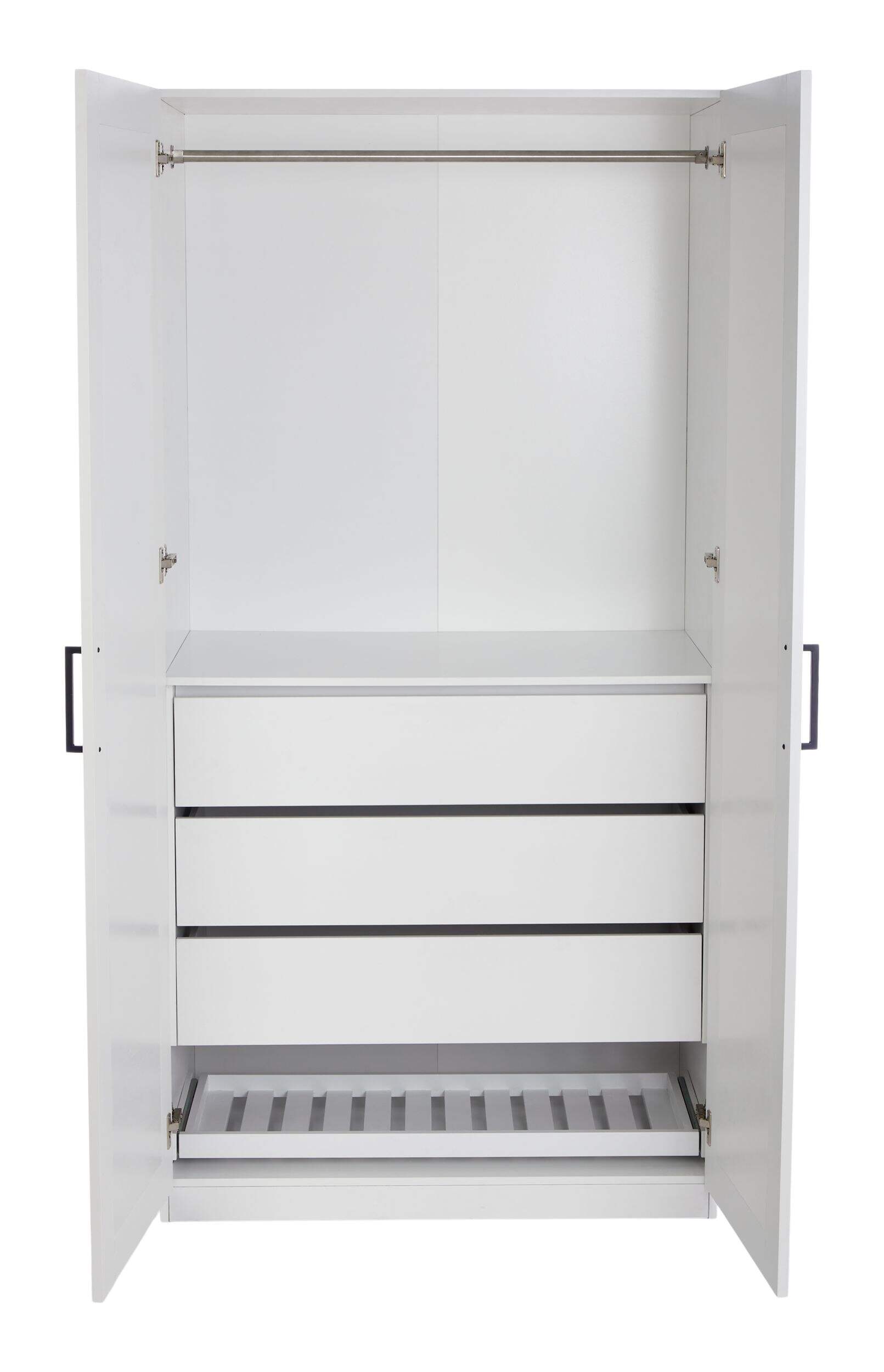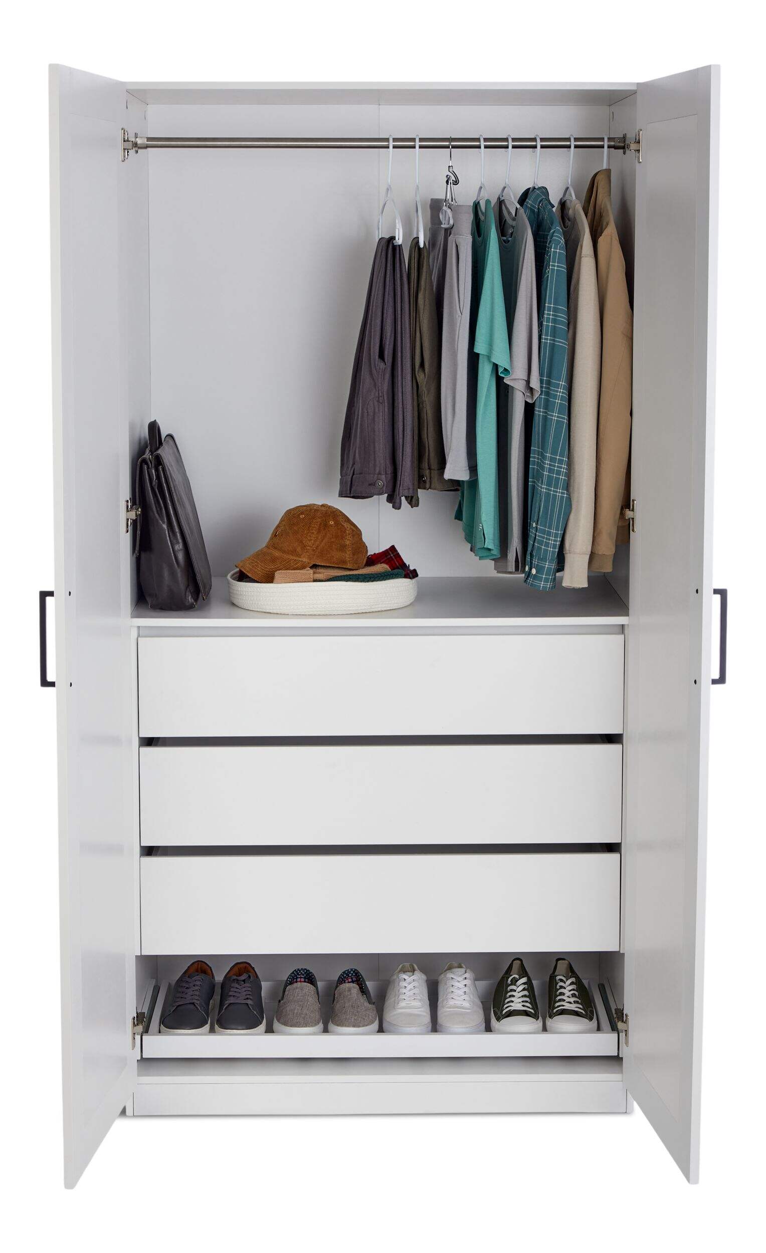 Comprend 1 tablette fixe, 3 tiroirs, 1 porte-chaussures coulissant à lattes et une tringle de suspension