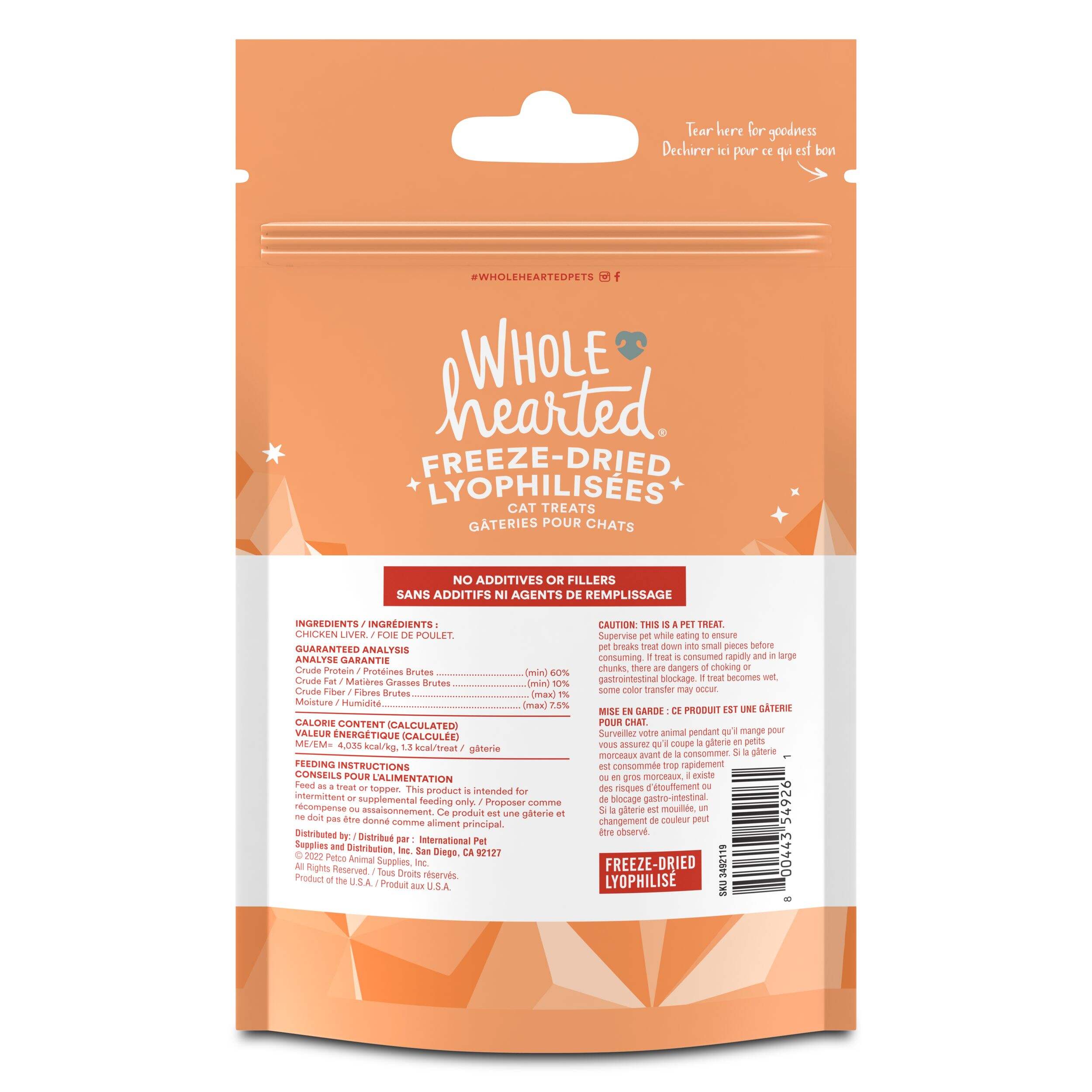 Gâteries pour chats lyophilisées WholeHearted au foie de poulet offrant aux chats une délicieuse gâterie sans agents de conservation