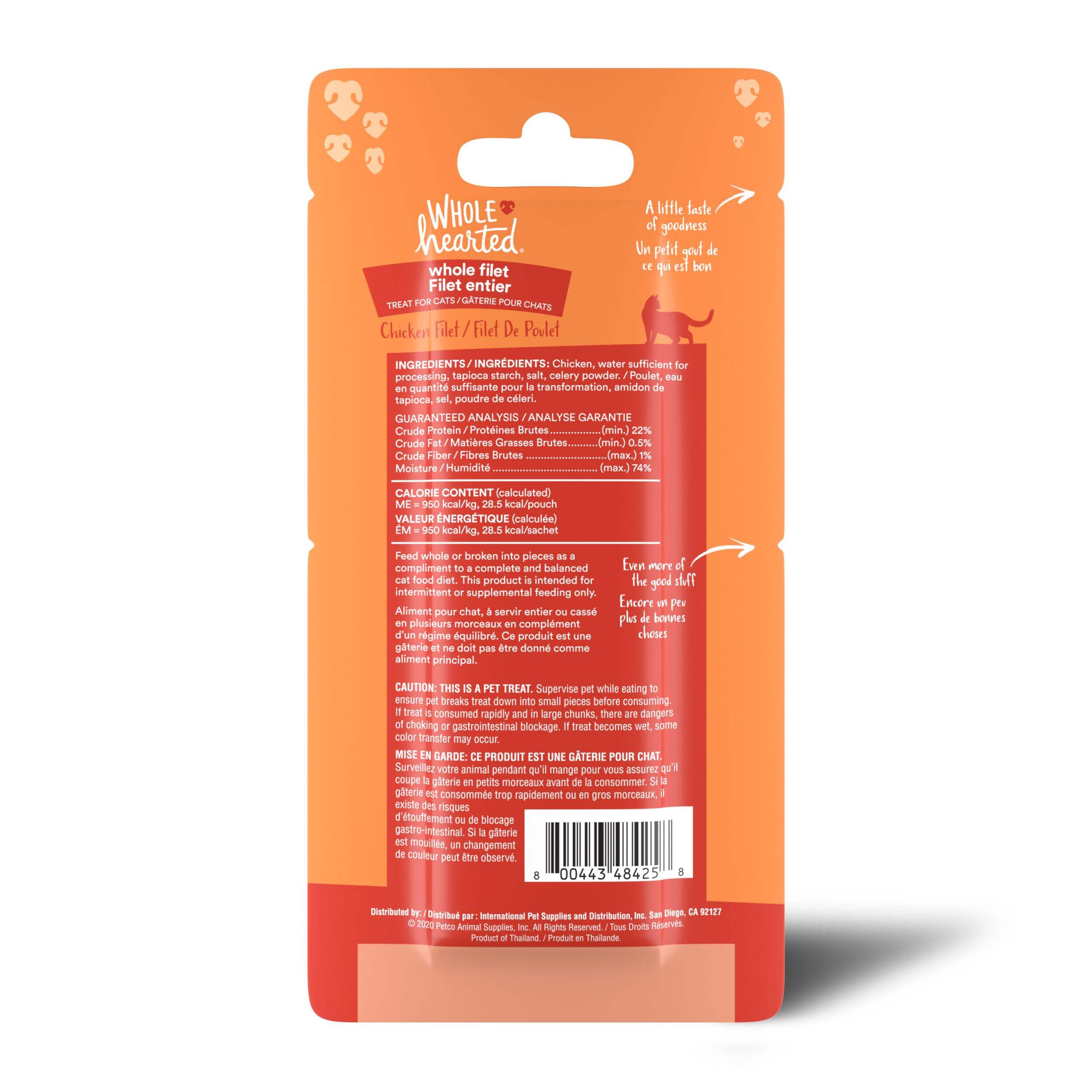 Gâteries pour chats riches en protéines WholeHearted, filet de poulet, qui goûtent la volaille fraîche et votre chat en redemandera. Filet qui ne contient ni colorants, arômes artificiels ou agents de conservation. Il constitue une excellente source de protéines et peut être servi entier ou coupé en dés pour servir comme garniture.
