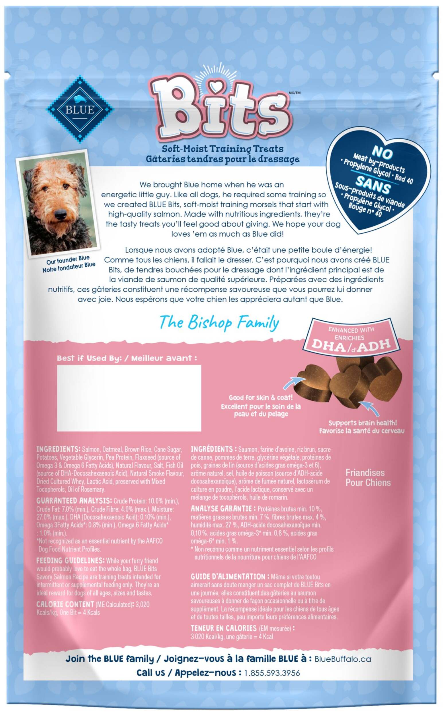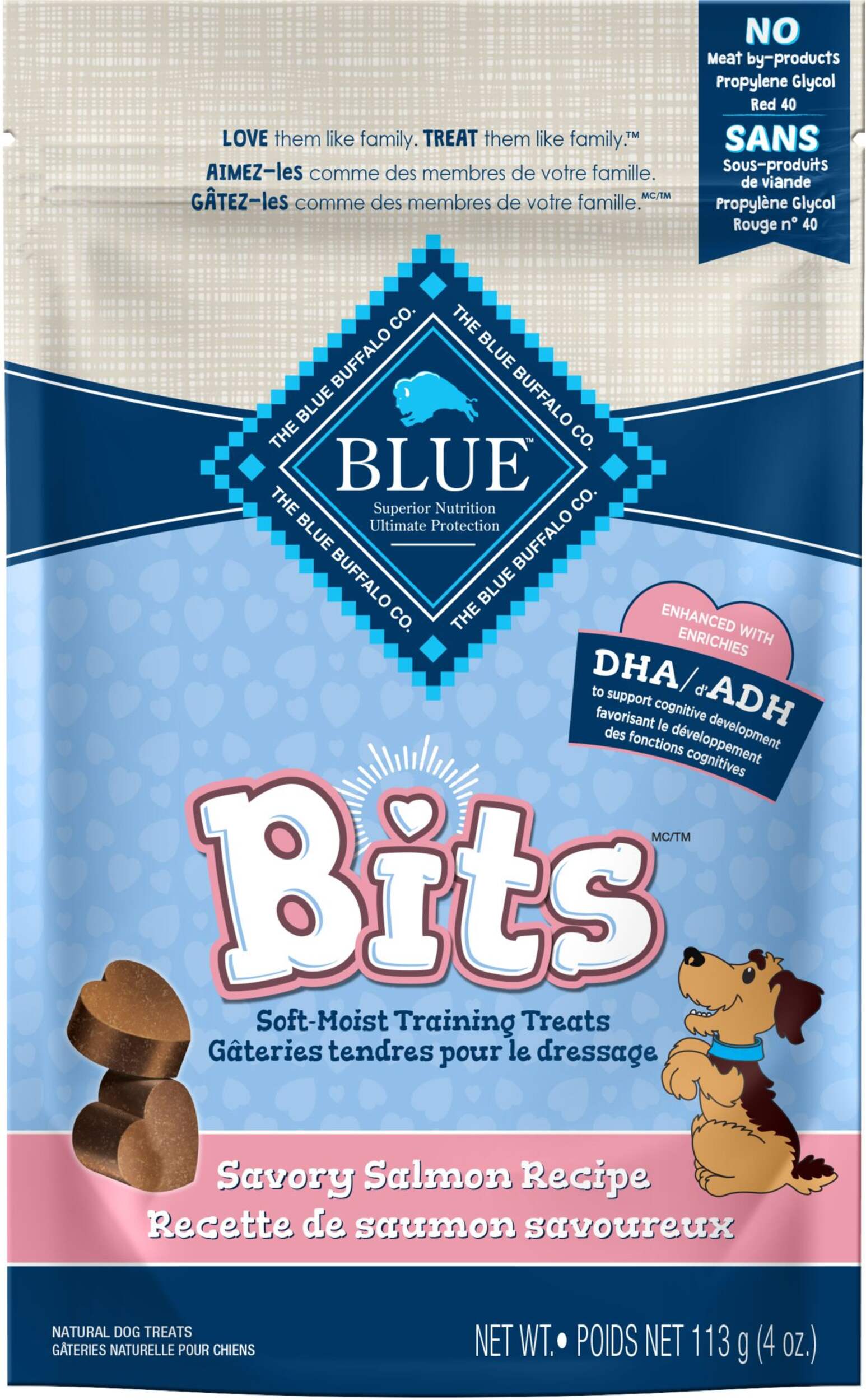 Gâteries pour l'entraînement BLUE Bits sont tendres, moelleuses et très savoureuses. Rempli de délicieux saumon de haute qualité et de DHA pour favoriser le développement cognitif, le mélange BLUE Bits est une récompense saine et nutritive que votre chien adorera.
