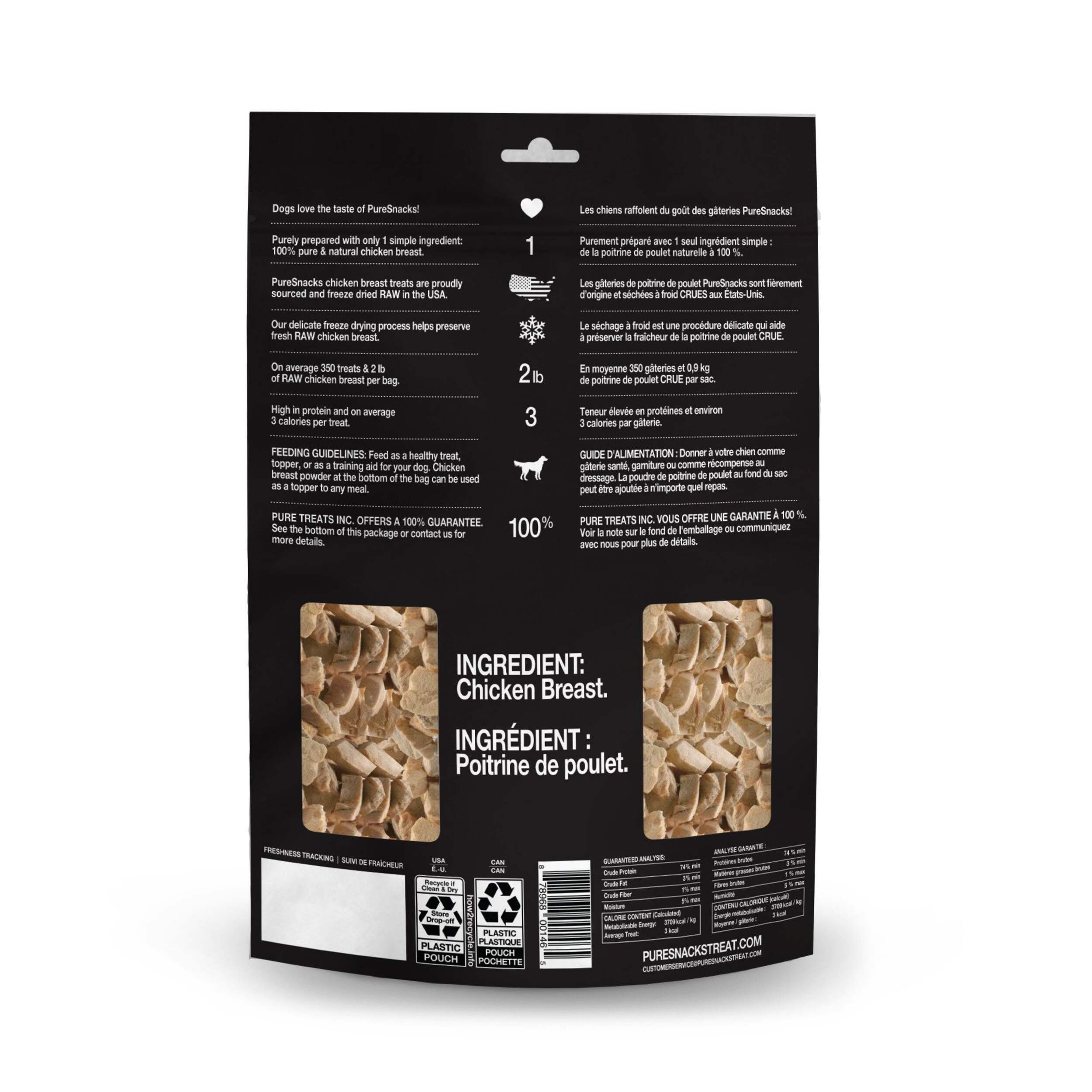 Vous ne devriez pas être le seul à manger des aliments avec des ingrédients que vous aimez. Comme vous, nous adorons nos animaux de compagnie et nous nous soucions de leur santé. C'est pourquoi nous avons créé PureSnacks, des gâteries ou des garnitures faites avec les mêmes ingrédients simples soigneusement sélectionnés que vous trouverez à votre épicerie locale. Nous n'avons rien à cacher. Nos gâteries de poitrines de poulet lyophilisées ne contiennent qu'un seul ingrédient : poitrine de poulet de qualité humaine provenant des États-Unis. Nous prenons la poitrine de poulet CRUE et nous la mettons délicatement au congélateur pendant 24 heures. Résultat qui est une collation pure avec une nutrition imbattable, qui sent fantastique et qui a encore meilleur goût. Nous sommes une fière entreprise canadienne, créée en 2005, qui traite et nourrit des millions de chiens et de chats chaque année.