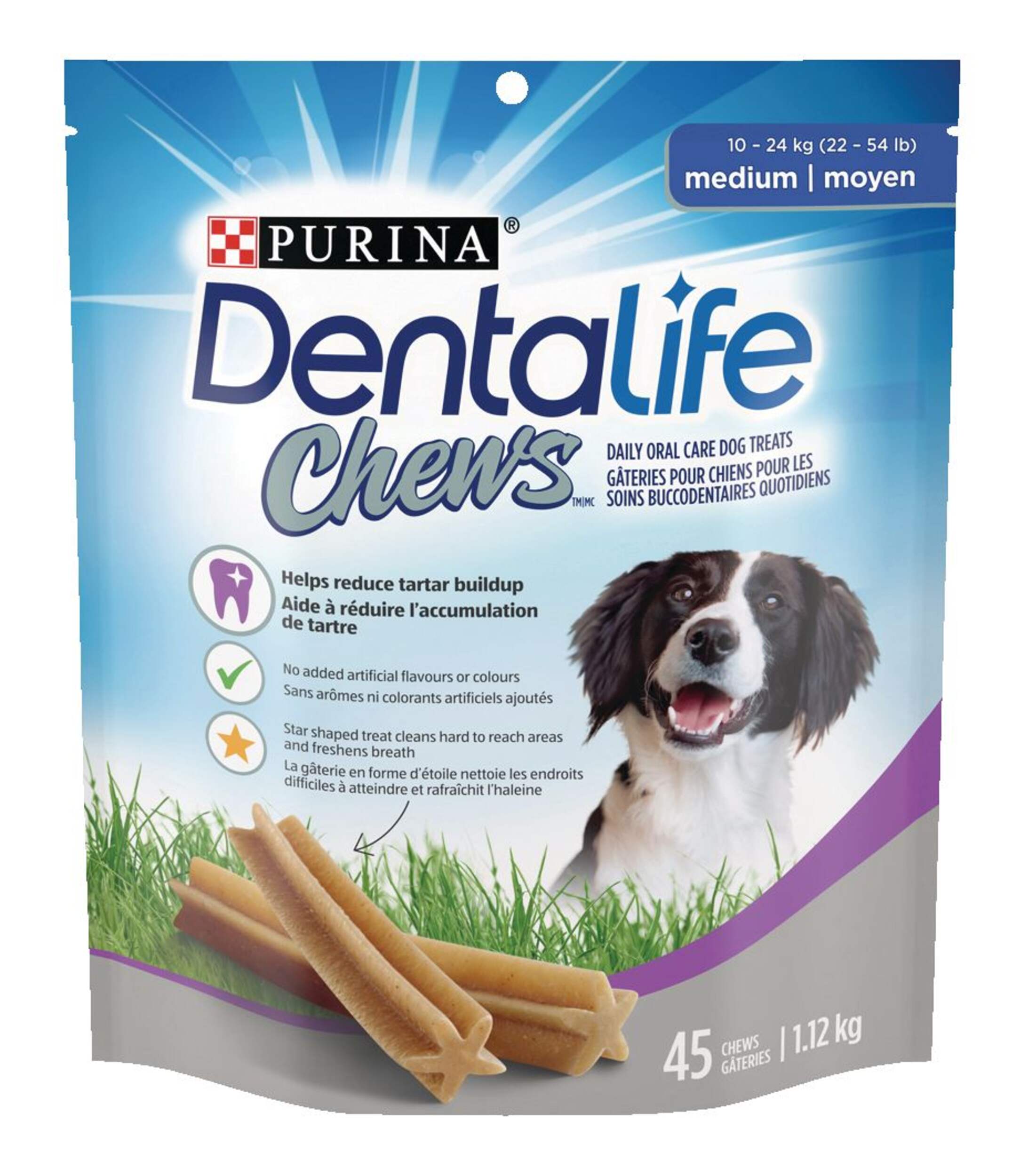 Santé buccale qui est importante pour le bien-être général de votre chien. Gâteries pour soins buccodentaires quotidiens des chiens DentaLife ChewsMC qui sont des gâteries uniques en forme d'étoile qui nettoient les endroits difficiles d'accès, rafraîchissent l'haleine et aident à réduire l'accumulation de tartre. Fait avec des ingrédients sains dont votre chien raffolera, ces gâteries dentaires ne contiennent aucun arômes ni colorants artificiels. Pour des dents propres tout au long d'une longue vie saine, choisissez DentaLife. Pour la vie.