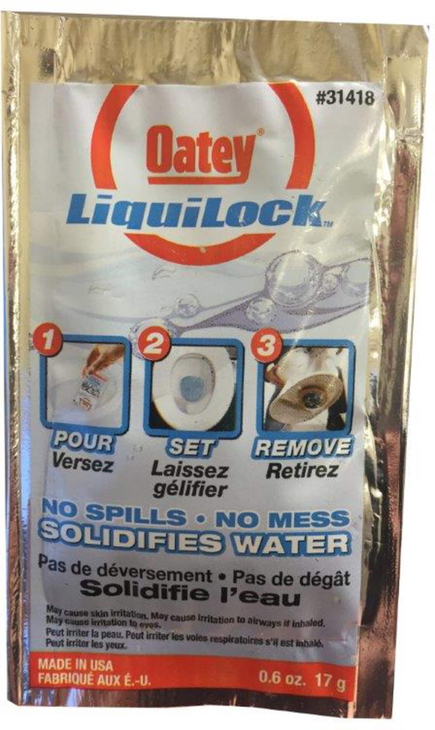 OateyMD LiquilockMC solidifie l'eau en 4 à 5 minutes pour aider à prévenir les gouttes et les fuites lors du retrait des toilettes. Le gel fige, puis se dissout lorsque de l'eau est ajoutée. Les articles d'Oatey ont gagné la confiance des professionnels de la plomberie depuis plus de 100 ans.
