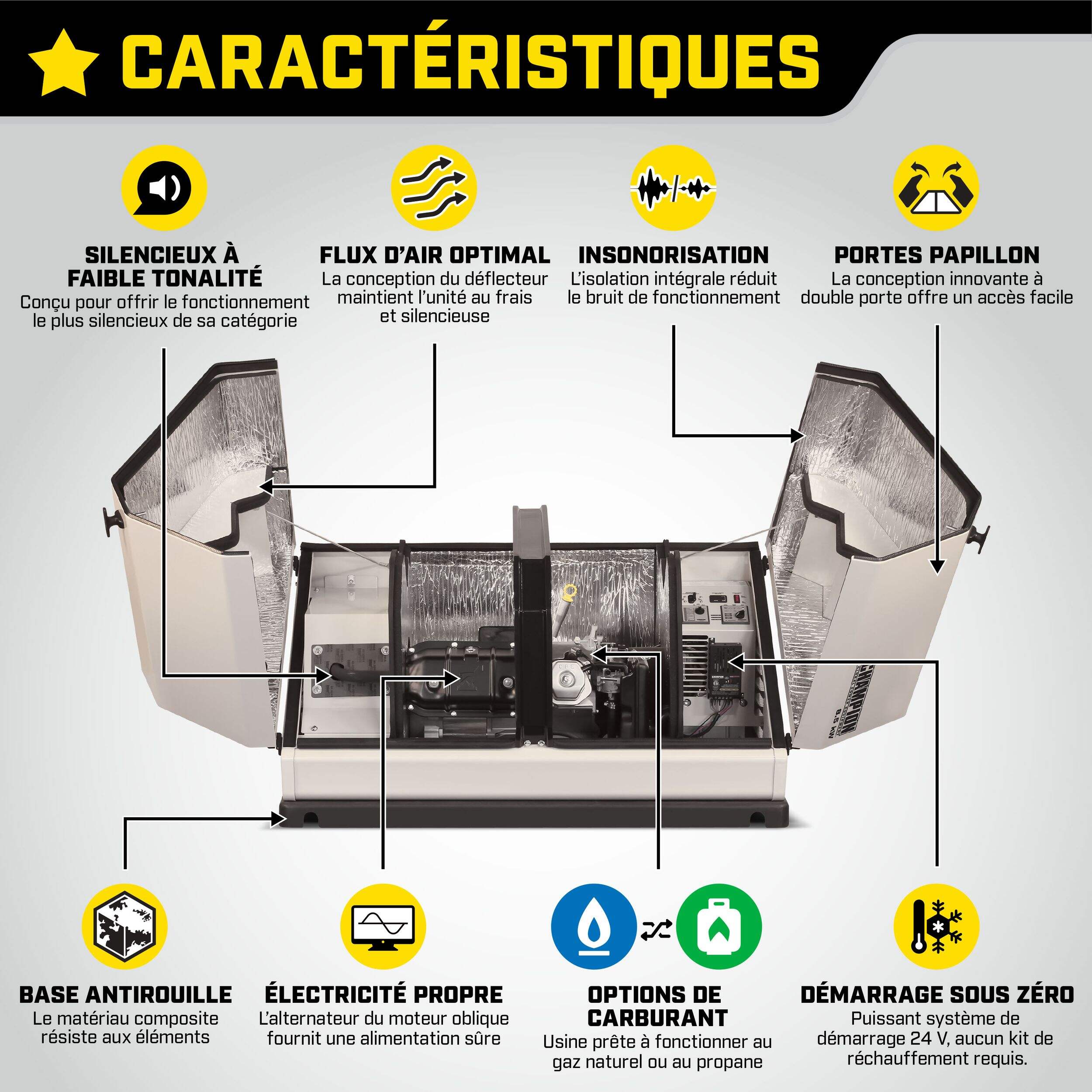 | Liste d’accessoires | Câbles de batterie et fixations, Tuyau d'alimentation flexible, Clés pour enceinte de génératrice de secours domestique, Outil de réglage de buse, Buses GPL, Bac à vidange d'huile |