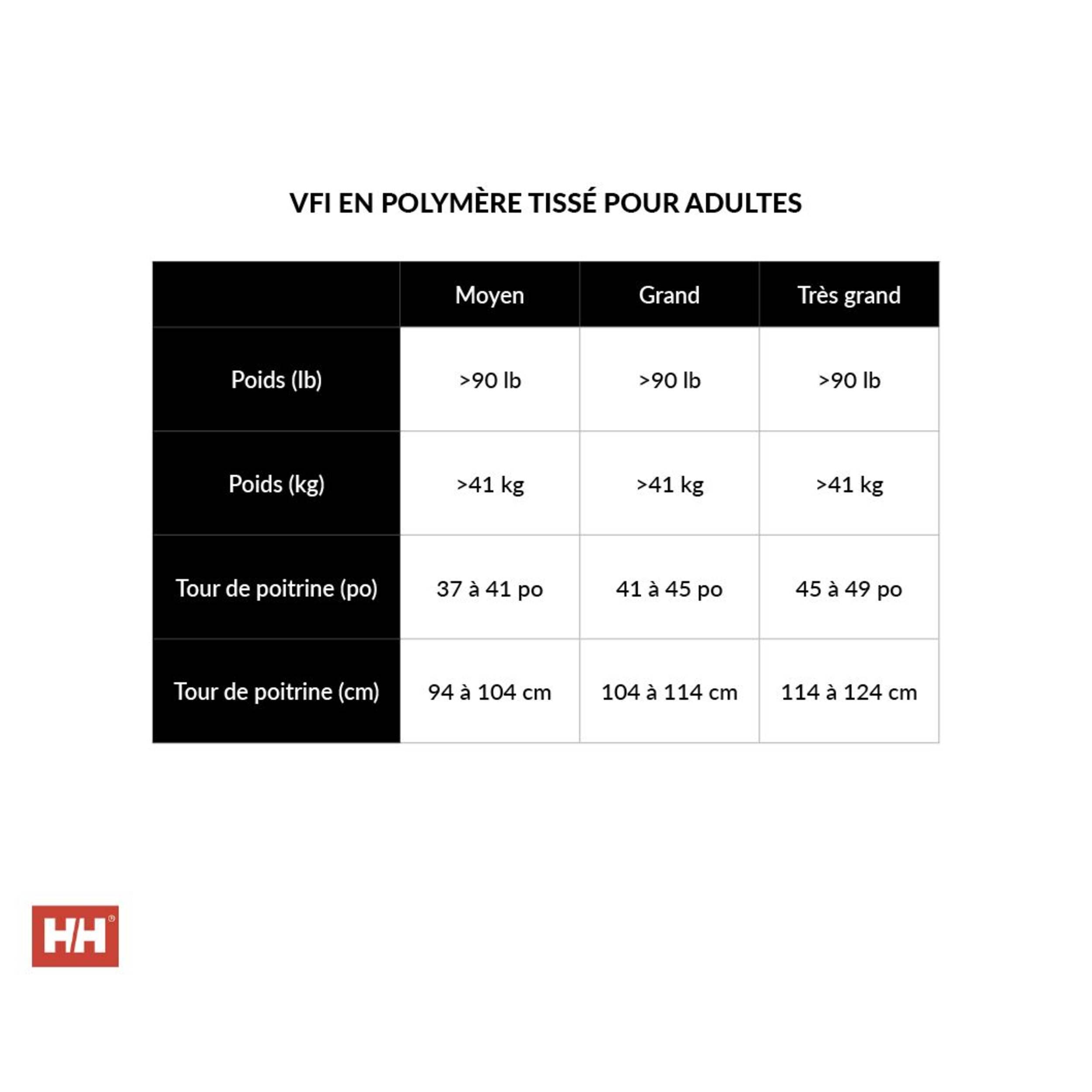 Tour de poitrine : moyen : 94 à 104 cm (37 à 41 po), grand : 104 à 114 cm (41 à 45 po), très grand : 114 à 124 cm (45 à 49 po)