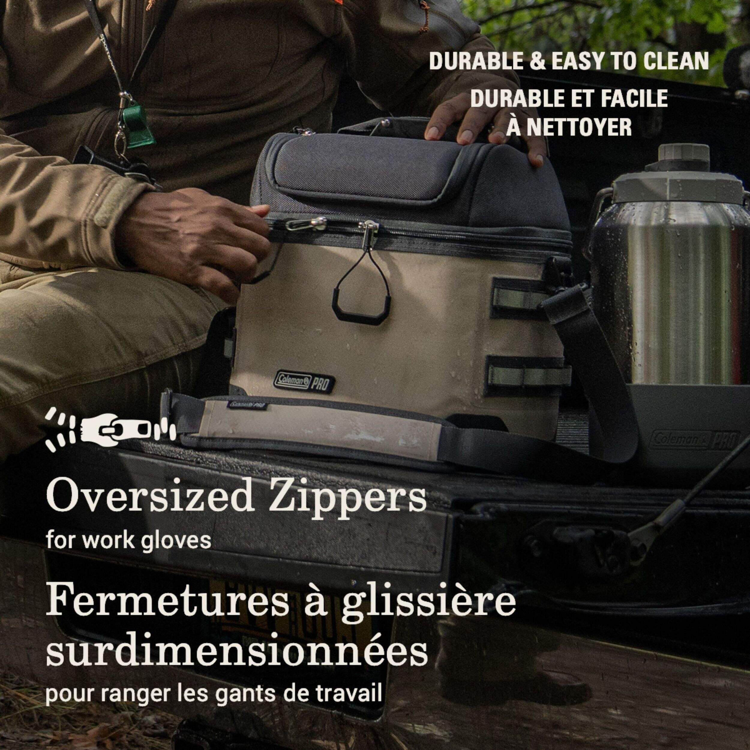 Coleman Pro : de l'équipement qui travaille aussi fort que vous. Il est spécialement conçu pour une utilisation quotidienne dans les environnements les plus exigeants. La glacière souple Coleman Pro de 16 canettes garde votre repas et vos boissons au frais pendant que vous travaillez et un compartiment de rangement sec séparé garde vos clés, votre téléphone et plus encore à portée de main. Robuste, l'extérieur durable résiste aux perforations et est couvert par une garantie limitée de 3 ans. La base moulée par compression protège la glacière souple et aide à prévenir les fuites. Portez la glacière souple Coleman à l'épaule pour garder vos mains libres et transporter facilement une boîte à outils ou de l'équipement de pêche. Travaillez de manière plus efficace grâce aux grandes tirettes de fermeture à glissière, faciles à manipuler avec des gants de travail, et aux sangles MOLLE réfléchissantes offrant un espace de rangement supplémentaire.