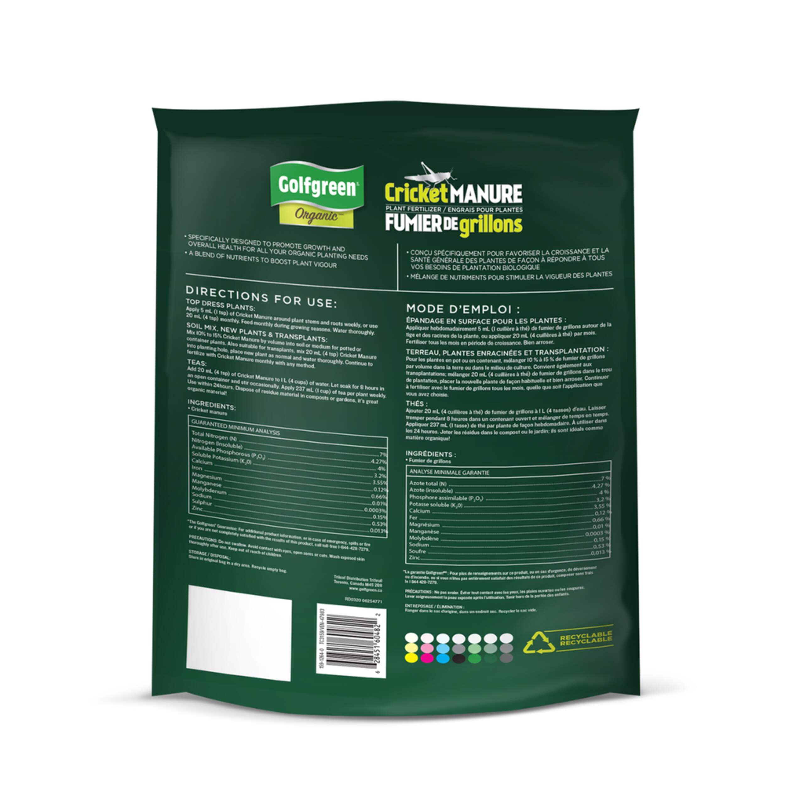 L'engrais pour plantes et fumier de grillons Golfgreen OrganicMCest une source durable pour vos plantes d'intérieur et d'extérieur. Cet engrais pour plantes contient des micronutriments et aucun agent de remplissage ni additif. L'engrais pour plantes est créé à partir d'un mélange d'azote, de phosphore et de potassium (NPK) et garantit une bonne croissance. Article fièrement fabriqué au Canada.