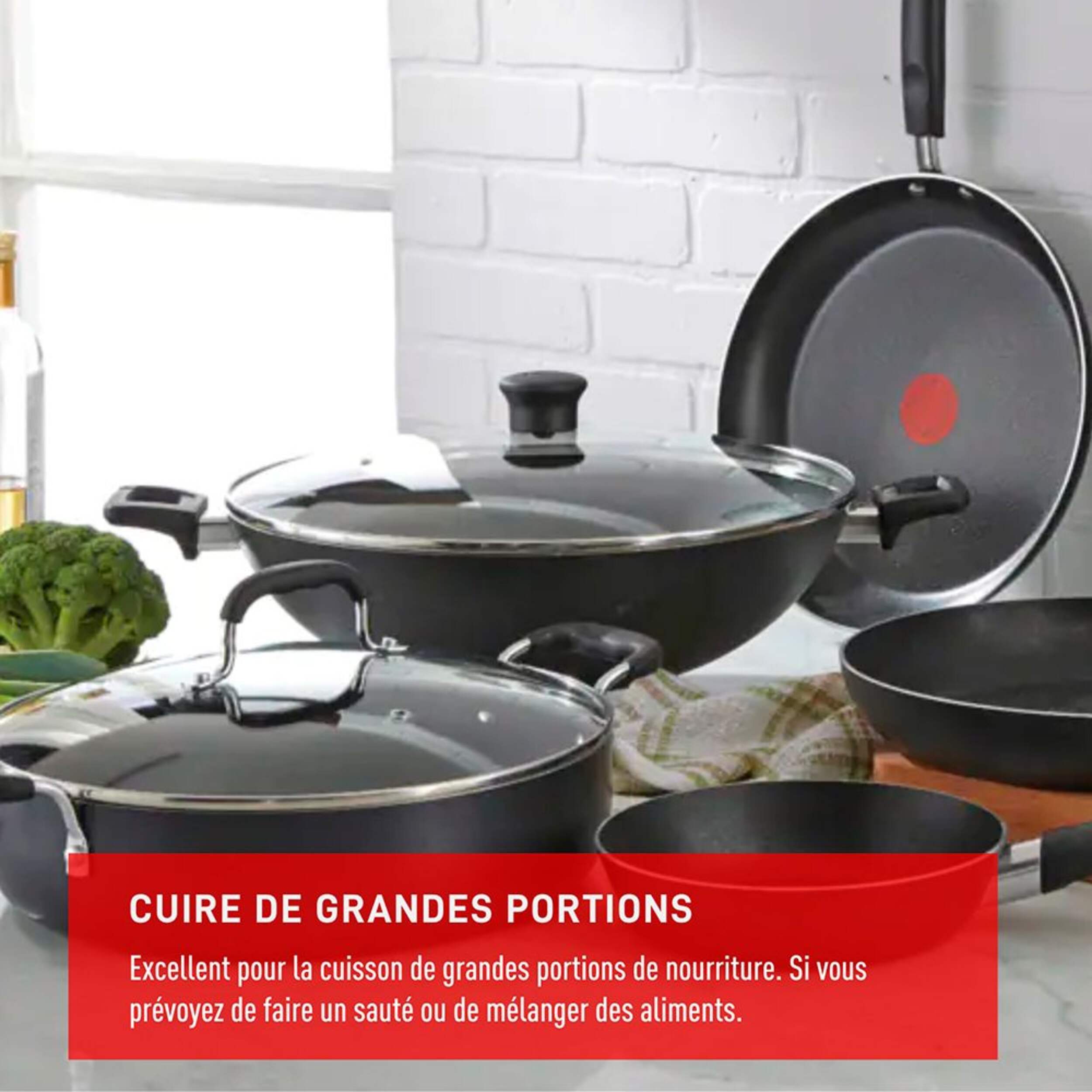 Préparez une variété de délicieux repas avec la poêle géante type wok T-fal avec couvercle, idéale pour les grands repas de famille et la cuisson polyvalente. Cette poêle type wok est spacieuse, ce qui vous permet de faire sauter, frire ou mijoter facilement. Le couvercle inclus aide à emprisonner l'humidité et la saveur pour un meilleure résultat. Que vous prépariez de superbes sautés ou des plats mijotés, cette poêle type wok est un accessoire de cuisine fiable essentiel pour un usage quotidien.