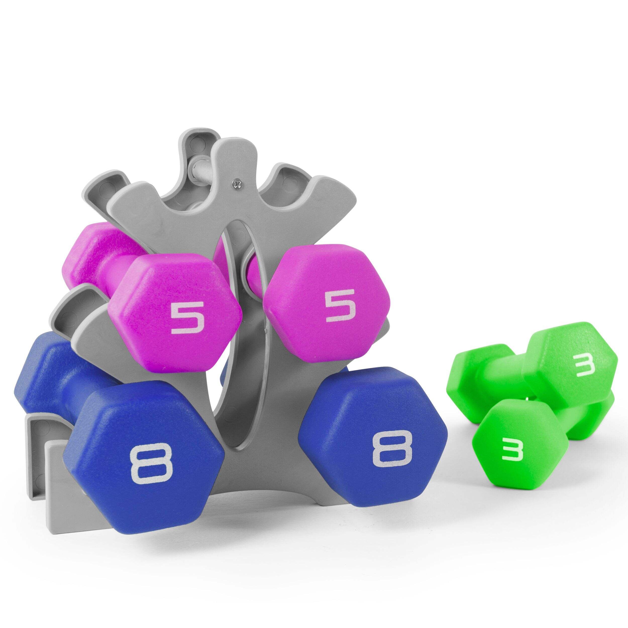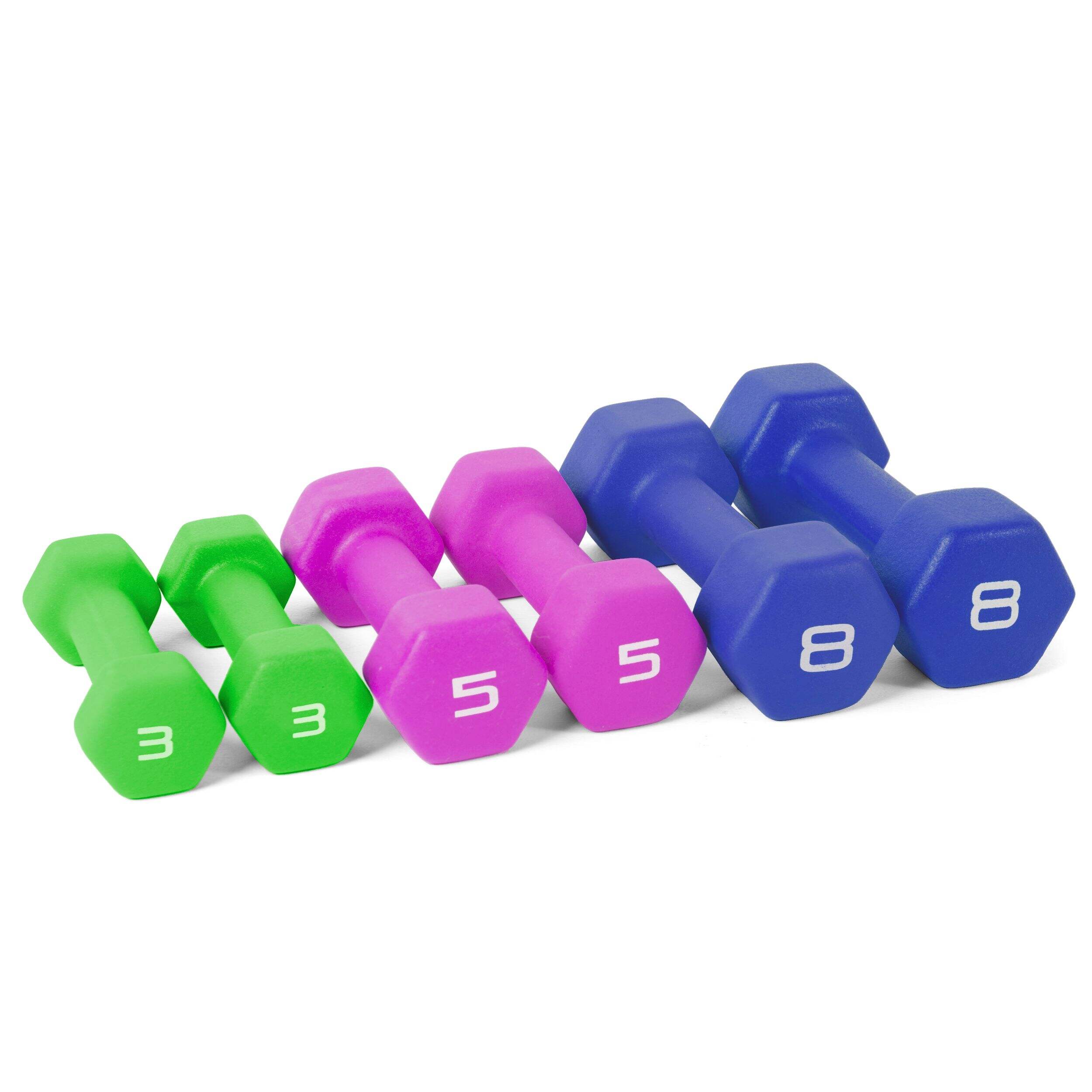Améliorez votre forme physique avec l'ensemble d'haltères en néoprène Cap Barbell. L'ensemble d'haltères comprend tout ce dont vous avez besoin pour commencer, y compris 6 haltères de forme hexagonale conçus pour empêcher le roulement et une étagère de rangement assortie pour haltères. Cet ensemble d'entraînement est parfait pour une utilisation à l'intérieur comme à l'extérieur. Les haltères sont gainés de néoprène résistant pour une prise facile et sont offerts en différentes couleurs pour vous permettre de les repérer facilement.