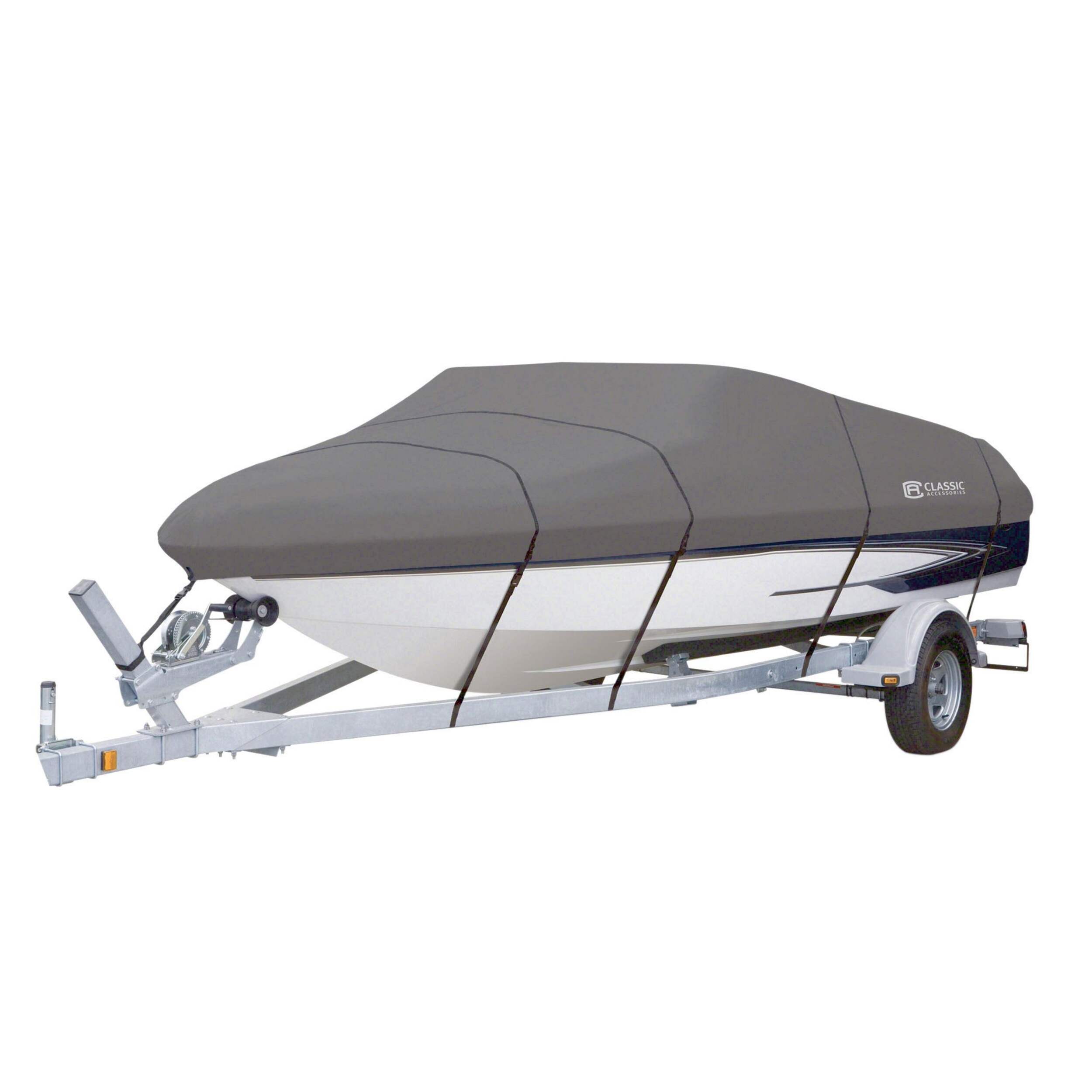 Protégez votre bateau contre les intempéries avec la housse hydrofuge robuste Hydroflo de Classic Accessories. Équipée d'un système de boucle et de courroies intégré, la housse Hydroflo est facile à ajuster et à fixer pour le remorquage. Des panneaux de renforcement sur la proue et la poupe ajoutent une durabilité accrue là où elle est le plus nécessaire. Les deux évents d'air arrière réduisent la pression du vent et préviennent l'accumulation d'humidité à l'intérieur, et un poteau de soutien empêche l'accumulation d'eau, prolongeant ainsi la durée de vie de la housse.