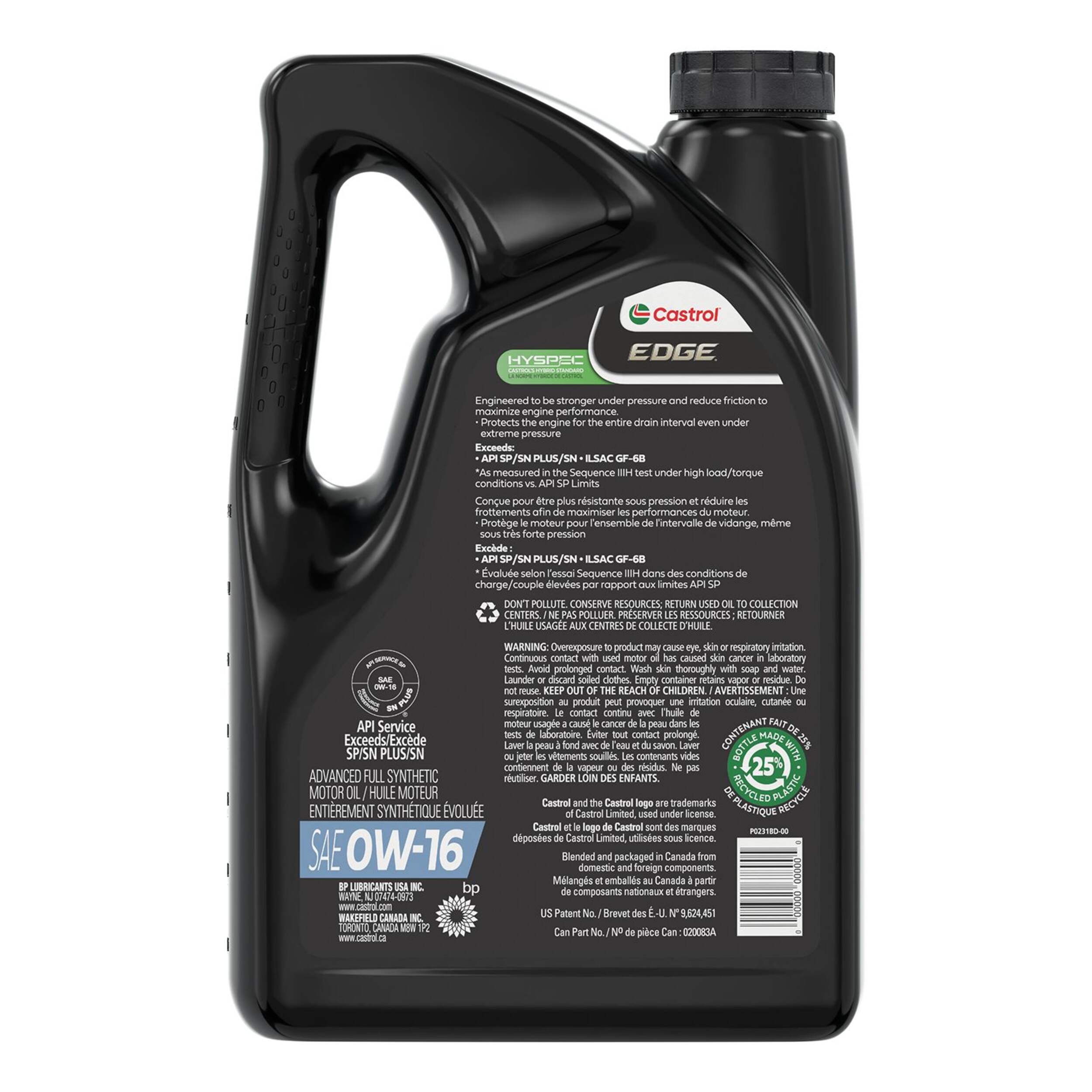 L'huile à moteur synthétique évoluée Castrol EDGE 0W-16 est conçue par ingénierie liquide pour s'écouler aussi facilement qu'une huile de poids 0 à températures hivernales, mais pour se comporter comme une huile de poids 16 lorsque le moteur a atteint sa température nominale de fonctionnement. Ceci assure que même dans les climats froids, l'huile commence à circuler immédiatement dans les conduites d'huile moteur pour lubrifier les pièces critiques du moteur. Si votre véhicule nécessite une huile à moteur d'une viscosité 0W-16, Castrol EDGE, une huile moteur entièrement synthétique évoluée 0W-16, est notre huile la plus puissante, conçue pour être plus résistante sous pression et lors des températures extrêmes.