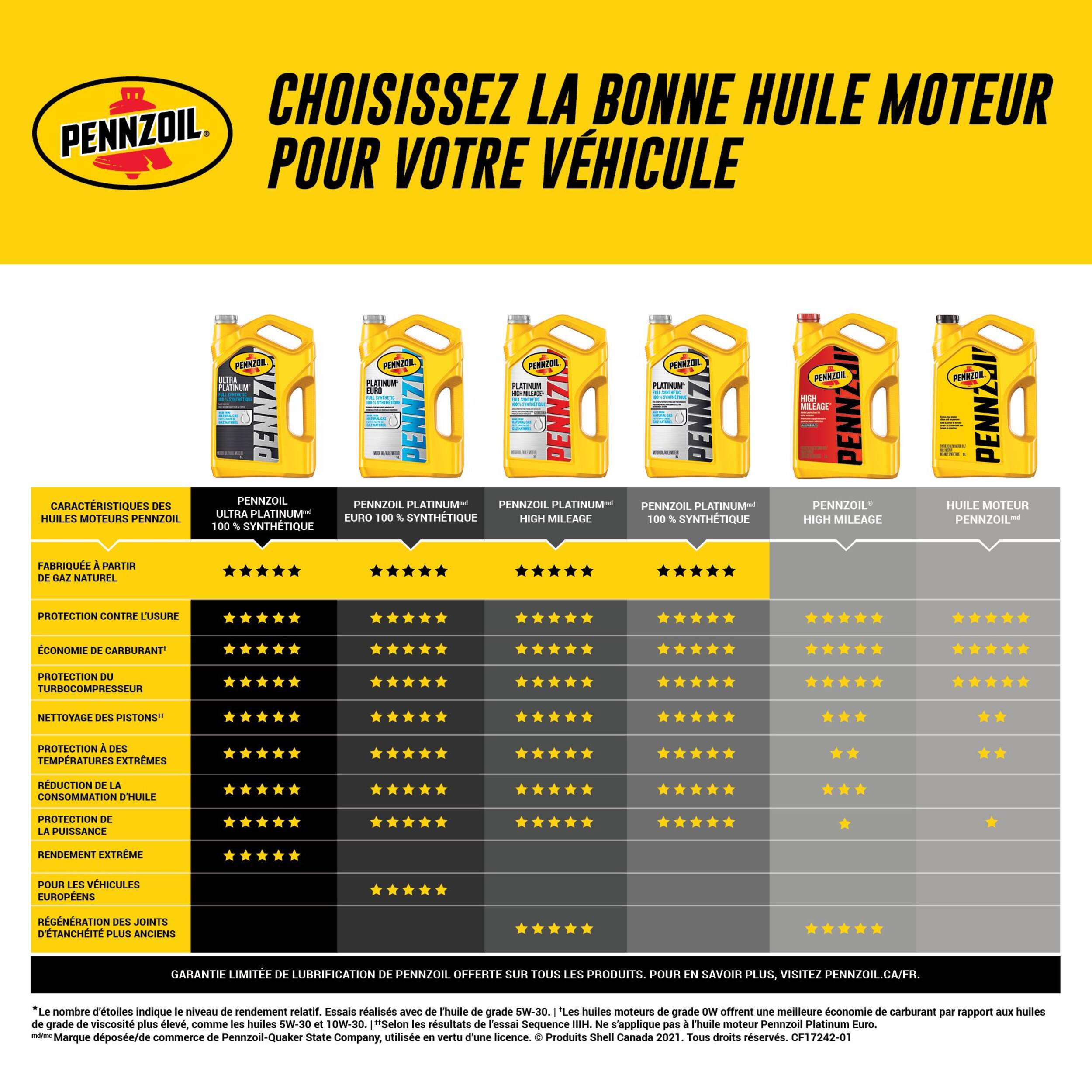 L'huile moteur entièrement synthétique Pennzoil Platinum SAE 5W-20 est conçue de façon unique à partir de notre technologie révolutionnaire de gaz en liquide PurePlusMC, qui convertit le gaz naturel pur en huile de base entièrement synthétique de haute qualité. Notre huile de base de haute qualité contient moins d'impuretés que les huiles de base faites de pétrole brut et combinée à notre technologie d'additifs de pointe, elle crée l'une des meilleures formules de notre gamme Pennzoil.