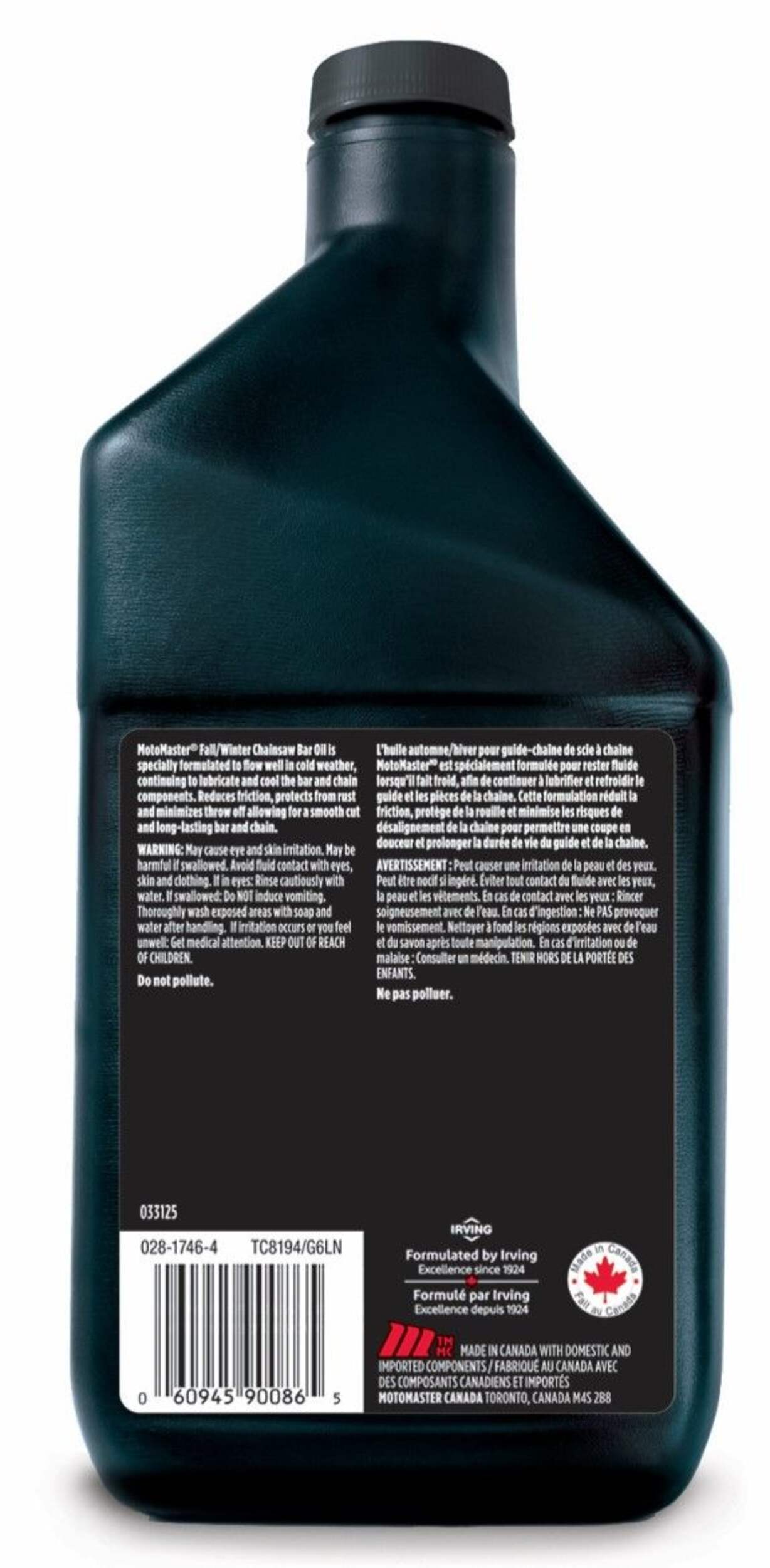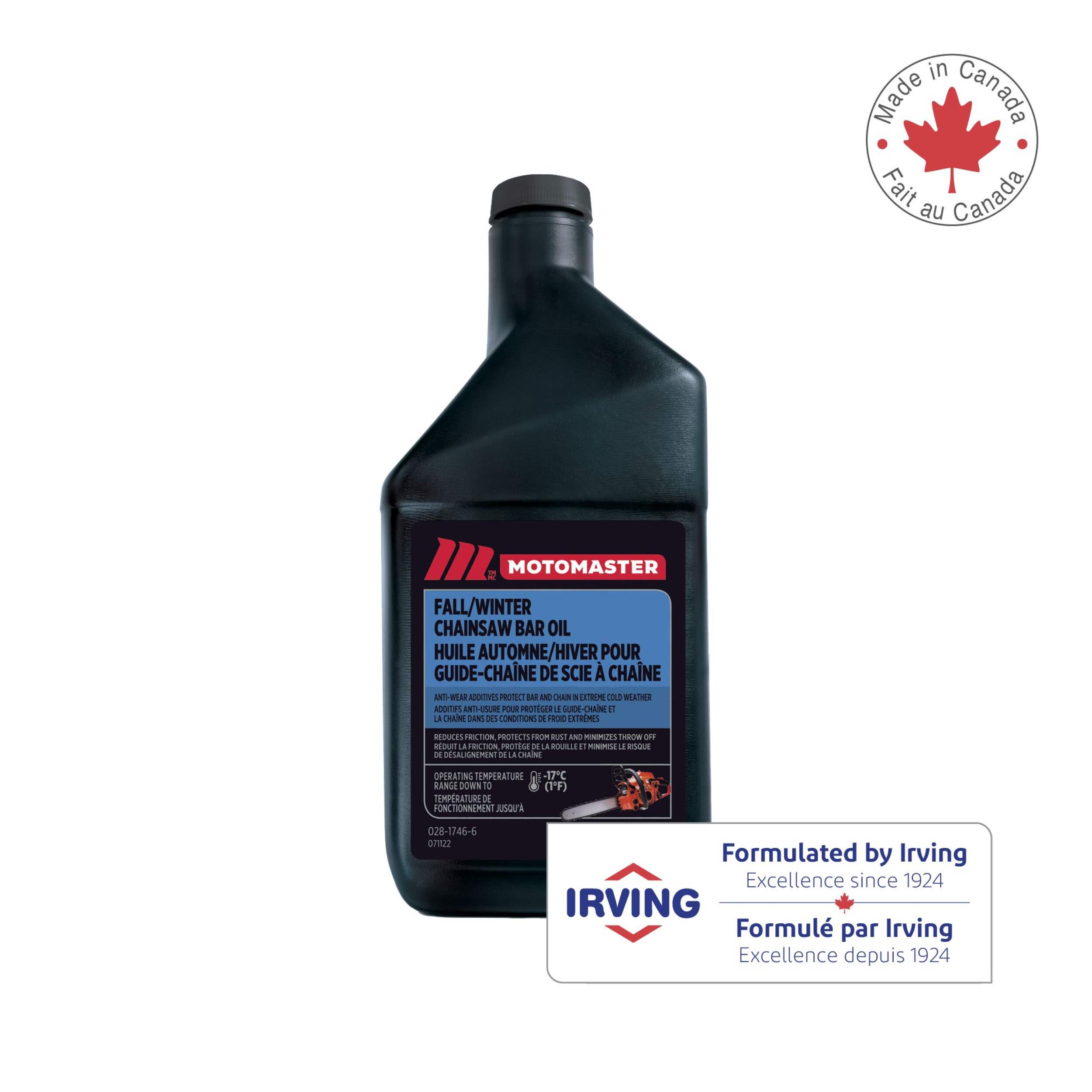 L'huile pour guide de scie à chaîne automne-hiver MotoMaster utilise une formule de qualité multiple pour assurer une lubrification et un refroidissement uniformes des composants du guide-chaîne et de la chaîne par temps froid. L'huile contient également des additifs qui protègent contre la friction et la rouille, ainsi que des agents adhésifs qui aident à réduire la perte d'huile. Pour plus de commodité, le liquide est teinté en rouge pour faciliter l'identification.