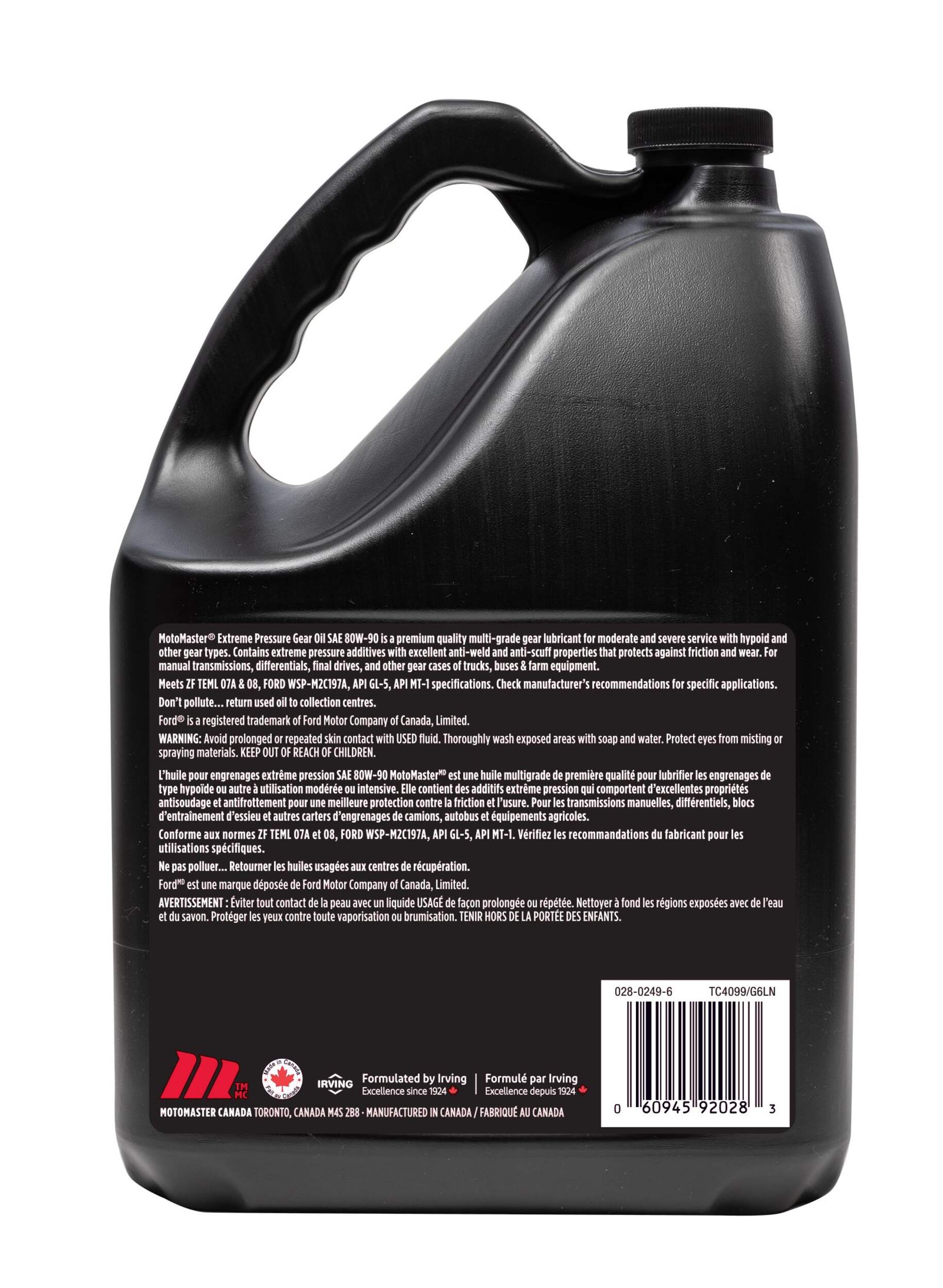 L'huile pour engrenages extrême-pression MotoMaster de 5 L est conçue pour résister aux pressions extrêmes des véhicules commerciaux et de l'équipement lourd. Elle est formulée avec un système d'additifs au soufre-phosphore, elle offre une protection essentielle anti-soudure, anti-abrasion et anti-usure aux composants essentiels comme les transmissions, les différentiels et les transmissions finales pour qu'ils puissent fonctionner à un rendement optimal. Cette huile pour engrenages résiste également à la perte de viscosité causée par le cisaillement, en maintenant sa barrière de protection même dans les applications les plus exigeantes. Ses additifs pour pression extrême empêchent les éraflures, le soudage et l'usure prématurée qui entraînent des réparations coûteuses et des temps d'arrêt. Avec près d'un litre de protection de qualité supérieure, cette huile pour engrenages est idéale pour remplir ou remplacer le liquide d'origine de la plupart des différentiels standard et de service intense.