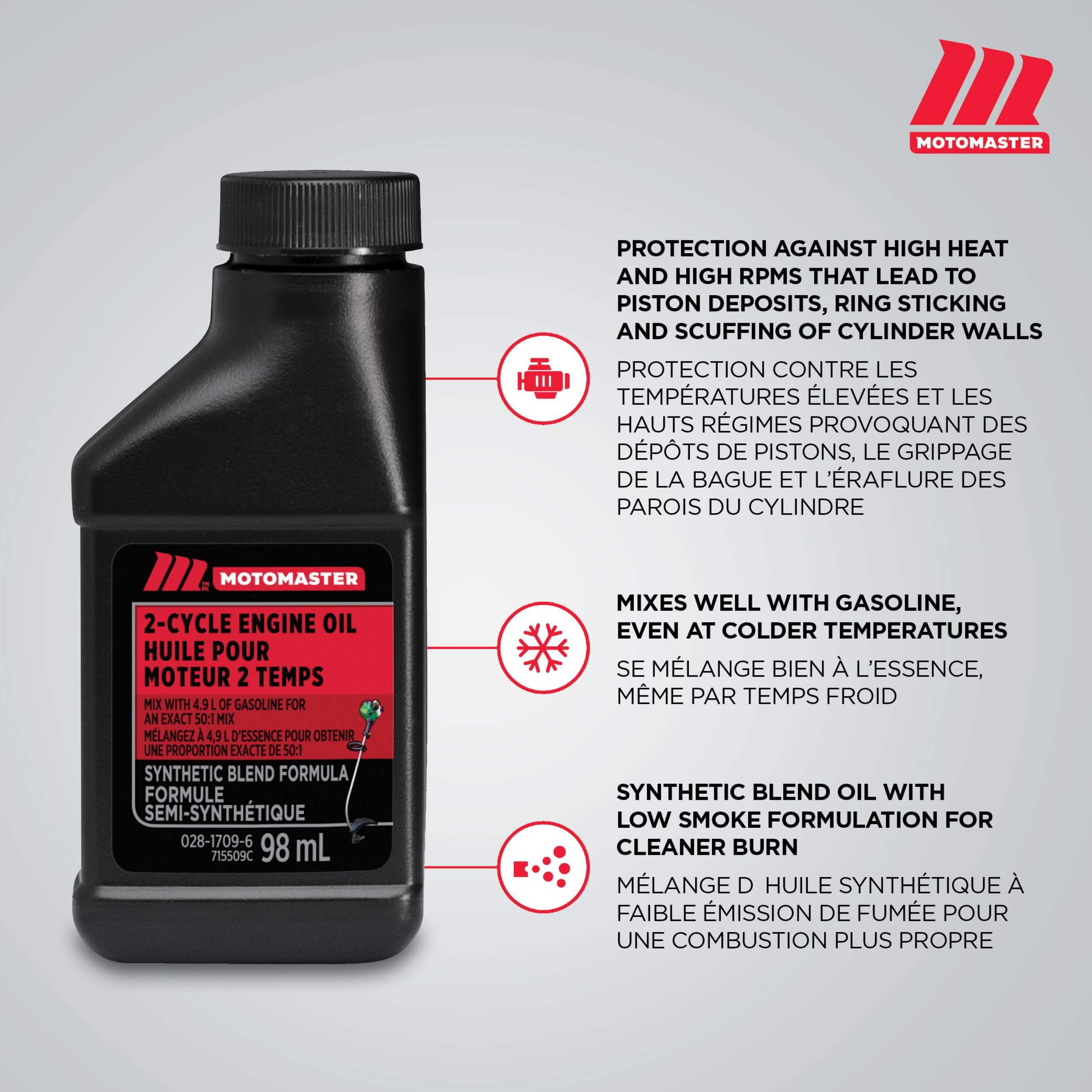 Huile à moteur à 2 temps MotoMaster à mélanger avec 4,9 L d'essence dans un bidon de 5 L pour créer un mélange de 50 pour 1