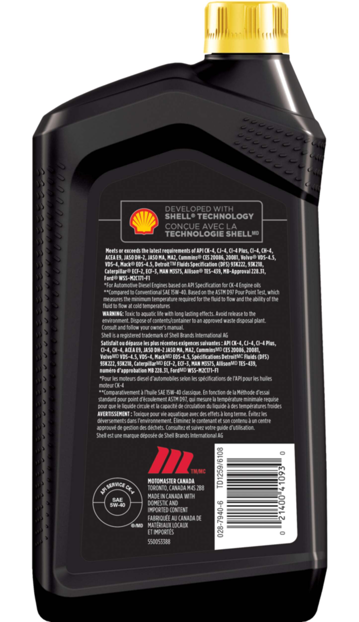 Huile à moteur diesel synthétique MotoMaster 5W40 de 946 mL offrant une protection complète pour une utilisation de longue durée. Huile moteur diesel offrant une protection accrue contre l'usure et la boue tout en prévenant la perte d'huile. Surpasse également les normes de performance API de base en matière de propreté des pistons et de performance à basse température. Développée avec la technologie Shell, l'huile pour moteur diesel utilise une combinaison équilibrée d'huiles synthétiques de base de qualité supérieure pour en améliorer les propriétés à haute et basse températures. Combinaison d'huiles de base synthétiques et d'une technologie d'additifs avancée qui prolonge les intervalles de vidange d'huile à condition de suivre les recommandations du fabricant du moteur. De plus, la consommation de carburant réduite et la lubrification supérieure au démarrage à basse température prolongent la durée de vie du démarreur et de la batterie. Huile moteur offerte en différents formats : 946 mL, 5 L, et 18,9 L.