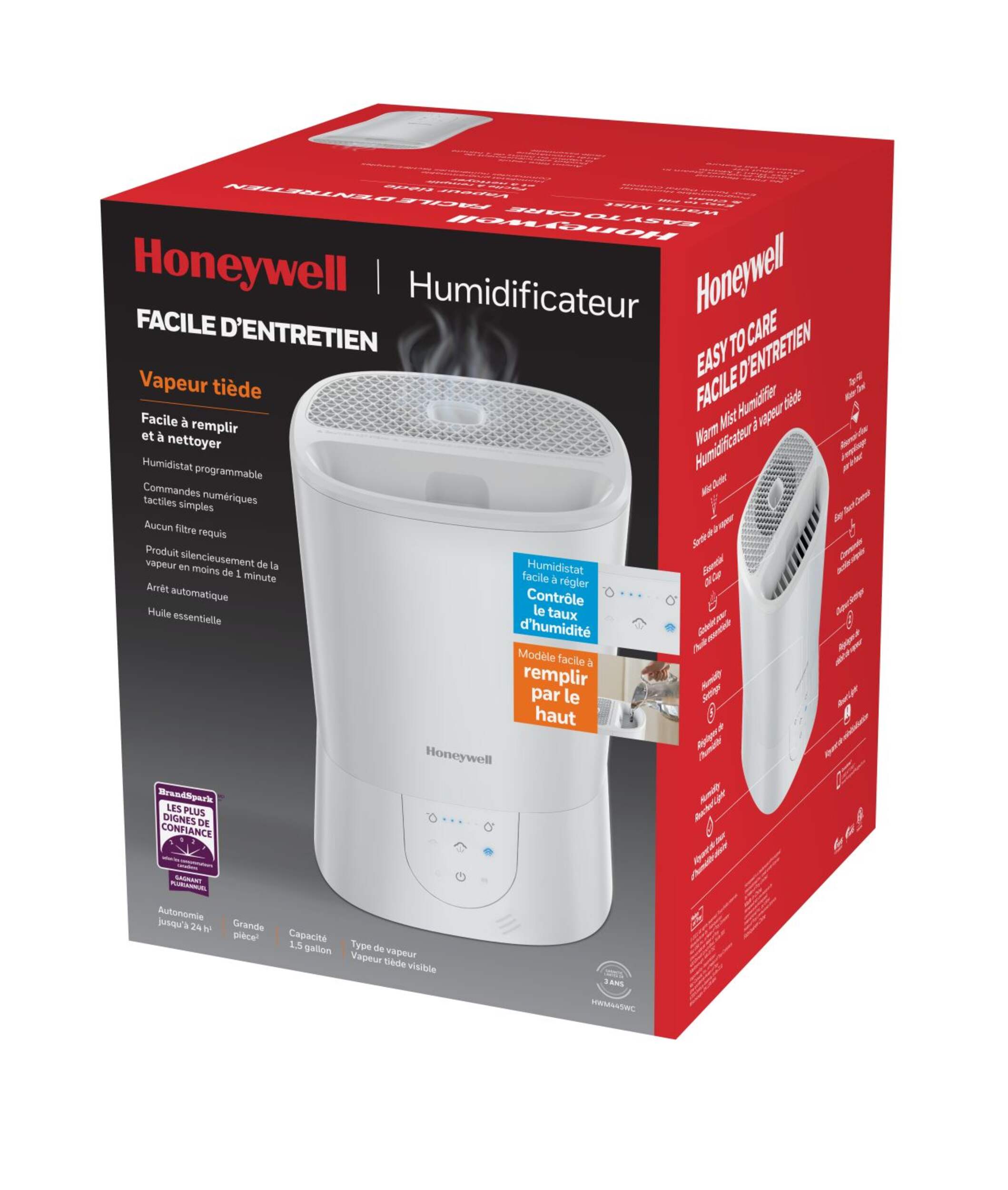 Apportez un soulagement rapide dans les pièces sèches avec l'humidificateur à brume tiède HWM445WC de Honeywell. Humidostat programmable vous permettant de contrôler le niveau d'humidité et arrêt automatique assurant la sécurité lorsque le réservoir est vide. Avec un réservoir de 1,5 gallon et un remplissage par le haut, il est facile à remplir et à nettoyer. Idéal pour les grandes pièces, il fonctionne jusqu'à 24 heures par remplissage, ce qui le rend idéal pour une bonne nuit de sommeil quand l'air est sec, pendant le temps des allergies ou lorsque vous vous sentez mal. Profitez d'une expérience sensorielle en ajoutant votre huile essentielle préférée au plateau d'huile essentielle.