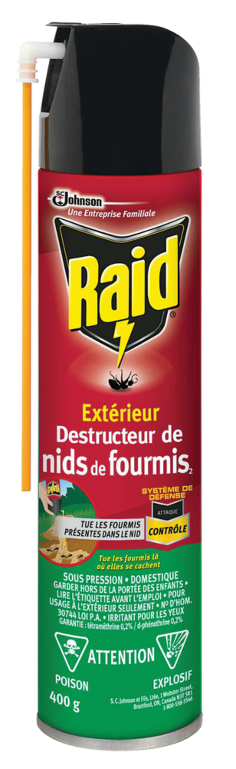 L'insecticide Raid pour nids de fourmis d'extérieur atteint et tue les fourmis là où elles se cachent. Sa buse et sa formule permettent d'atteindre les coins difficiles et de couvrir de grandes surfaces. La formule est conçue pour produire une mousse qui pénètre les endroits difficiles à atteindre des fourmilières ou les fissures et les crevasses des allées, des trottoirs ou des briques entrecroisées où se trouvent les fourmis. La mousse se dilate et tue les fourmis dans le nid au contact.