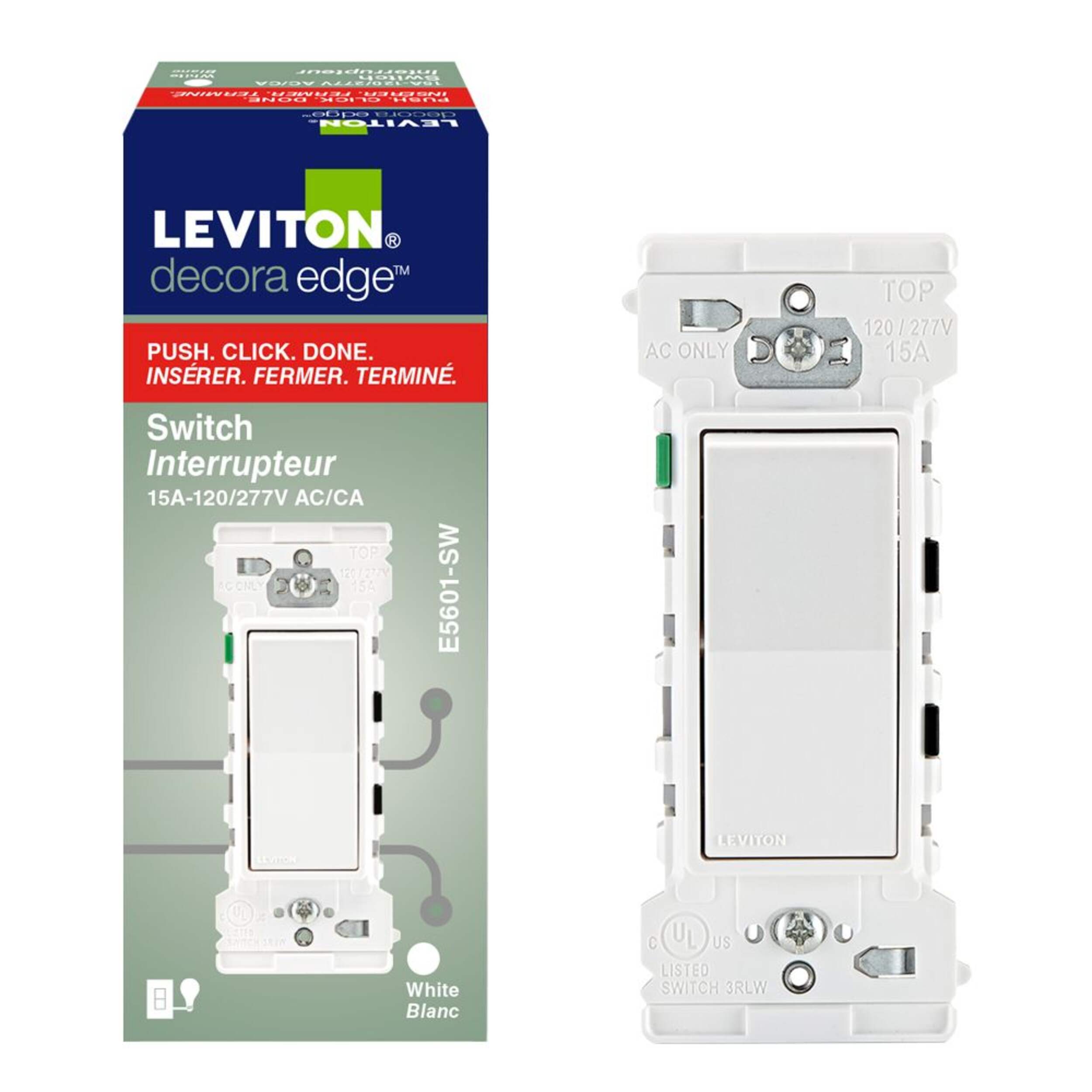 Interrupteur unipolaire Leviton Decora Edge 15 A plus rapide, plus sécuritaire et plus facile à installer grâce à sa fonctionnalité Push, Click, Done