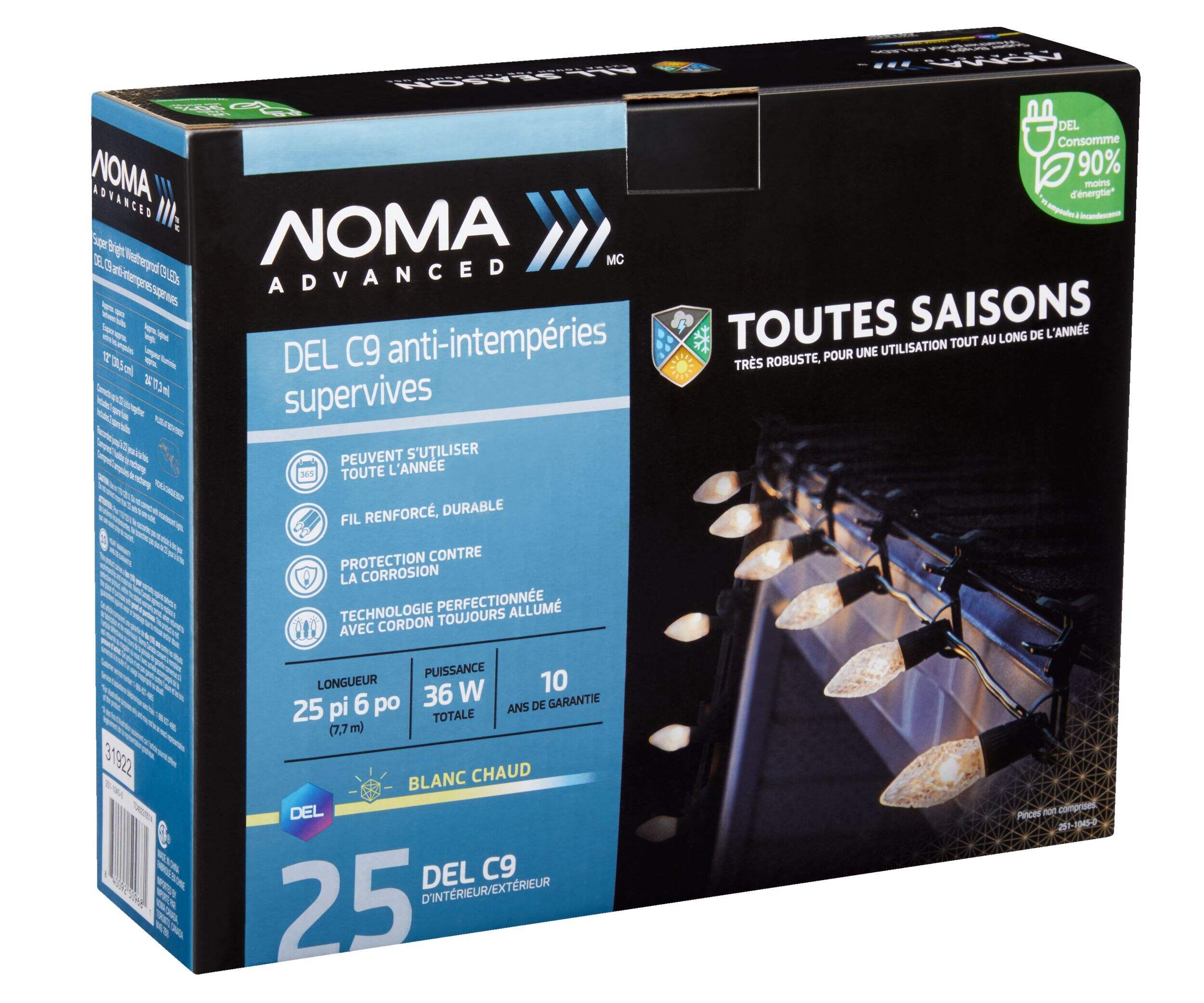 Les lumières de Noël de qualité commerciale NOMA C9 évoluées assurent un éclairage fiable pour votre maison toute l'année. Conçues pour une durabilité et une polyvalence accrues, ces lumières à DEL blanc chaleureux rehaussent magnifiquement n'importe quel espace avec une lueur accueillante. Conçues pour résister à diverses conditions météorologiques, elles assurent une performance exceptionnelle pendant la période des Fêtes et au-delà, ce qui en fait un excellent choix pour les décorations intérieures et extérieures.