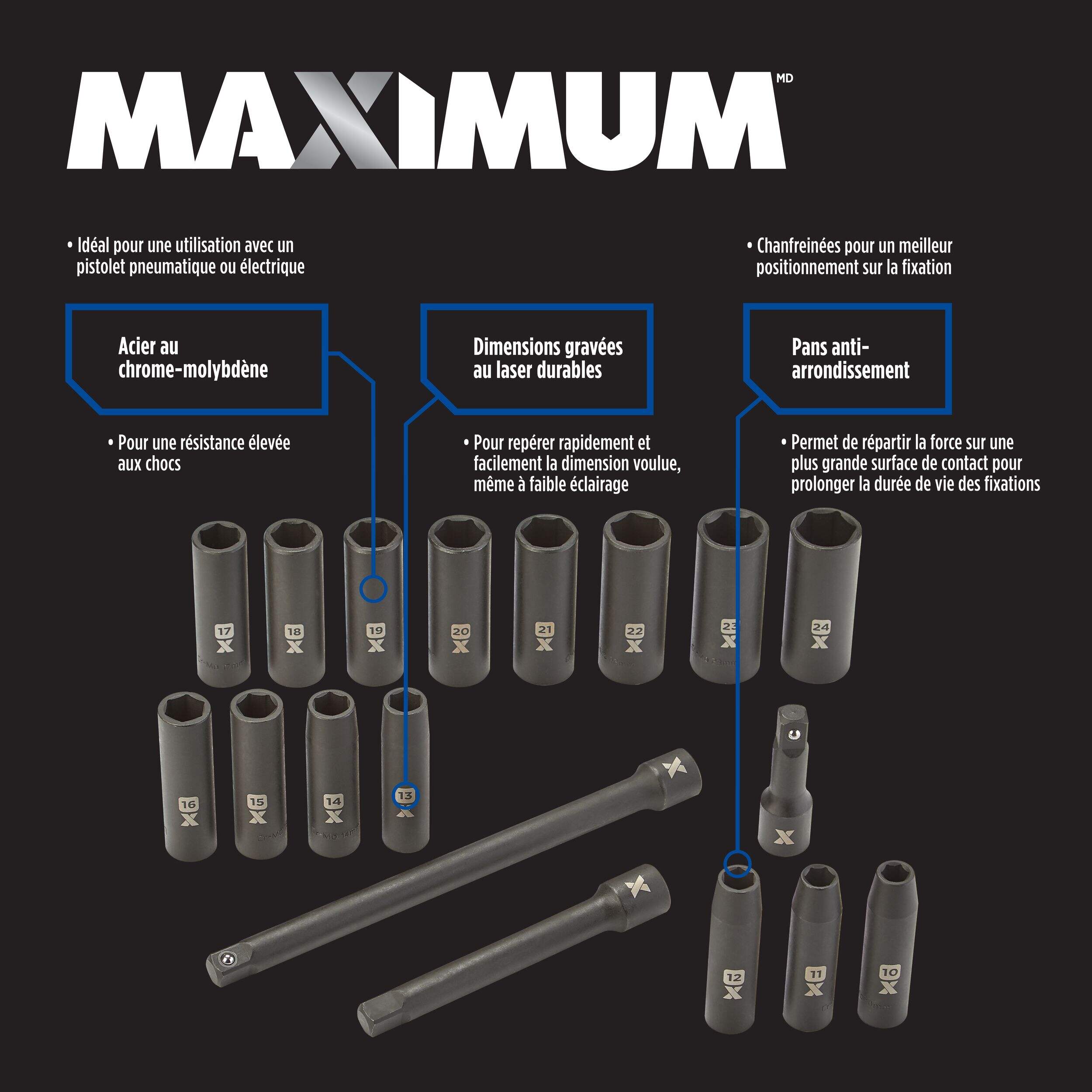 Comprend des douilles profondes de 1/2 po dans les tailles métriques suivantes : 10, 11, 12, 13, 14, 15, 16, 17, 18, 19, 20, 21, 22, 23 et 24 mm