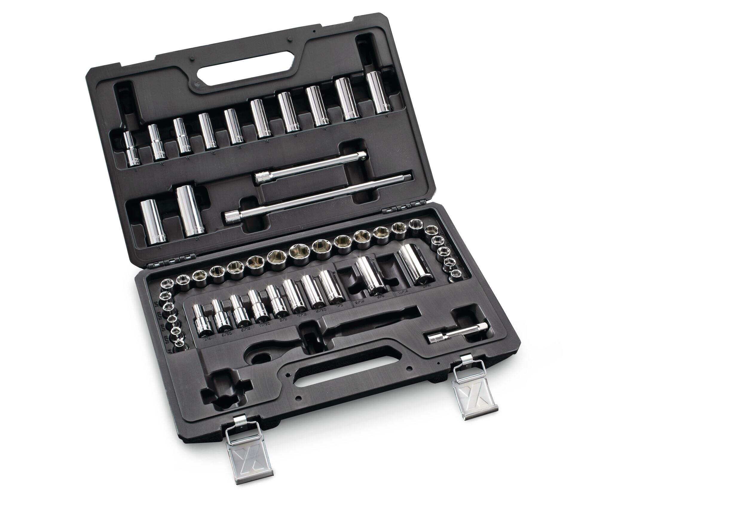 Comprend 24 douilles de tailles suivantes : 1/4 po, 9/32 po, 5/16 po, 11/32 po, 3/8 po, 7/16 po, 15/32 po, 1/2 po, 9/16 po, 5/8 po, 11/16 po, 3/4 po, 9 mm, 10 mm, 11 mm, 12 mm, 13 mm, 14 mm, 15 mm, 16 mm, 17 mm, 18 mm, 19 mm et 21 mm