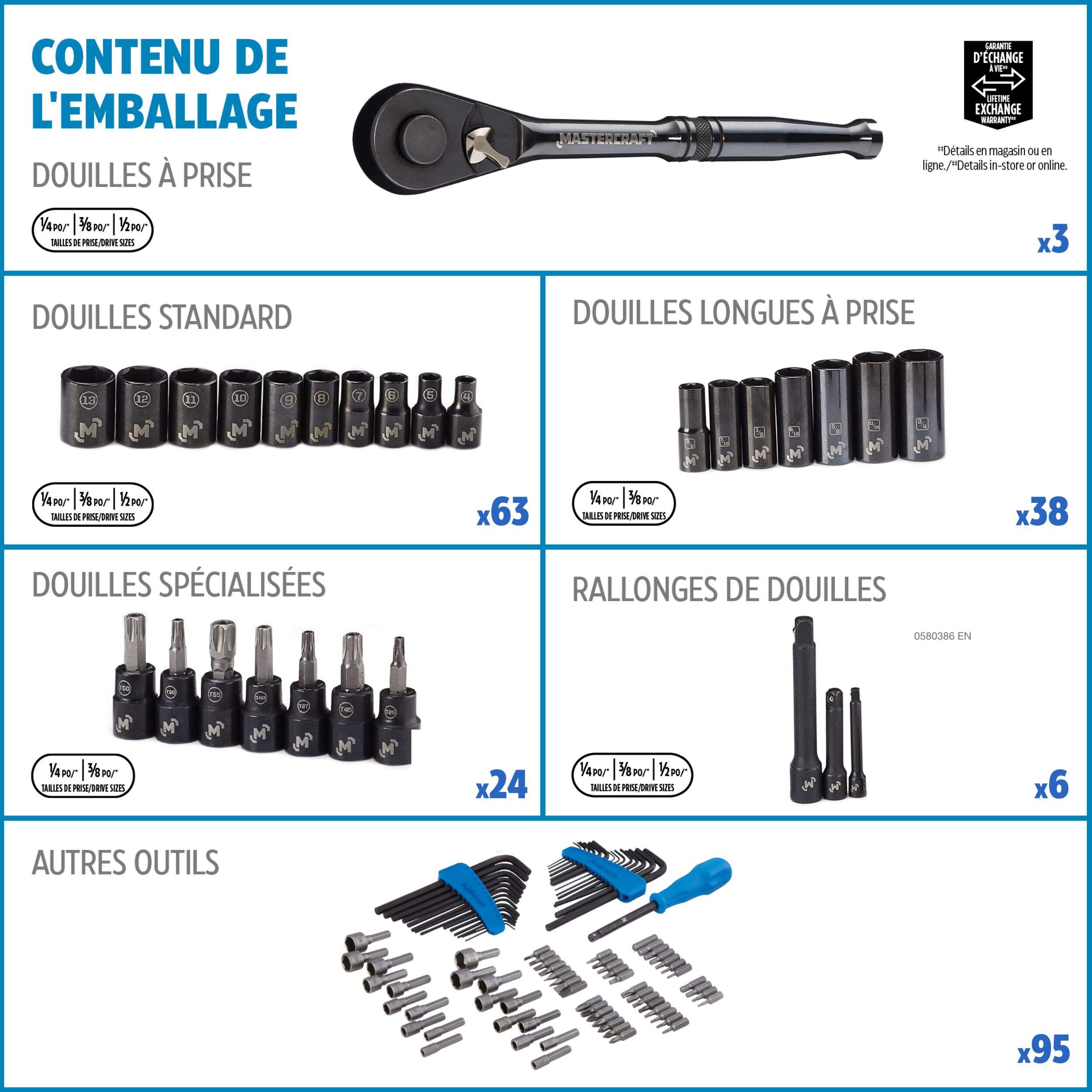 Comprend un assortiment de douilles standard, métriques, peu profondes et profondes dans les tailles de prises suivantes : 1/4 po (65), 3/8 po (70) et 1/2 po (24)