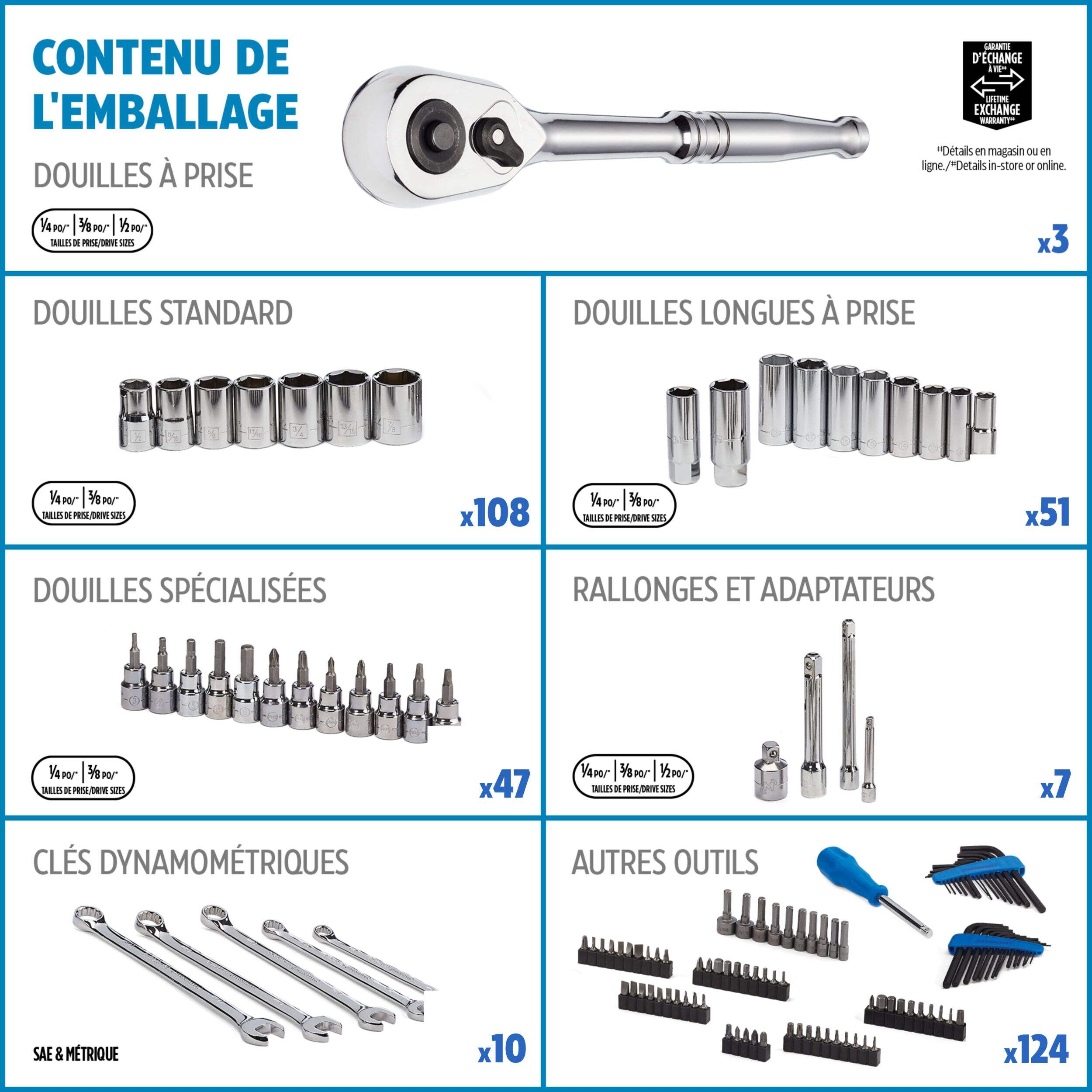 Comprend un assortiment de douilles standard, métriques, peu profondes et profondes dans les tailles à prise suivantes : 1/4 po (100 pièces), 3/8 po (89 pièces) et 1/2 po (50 pièces)