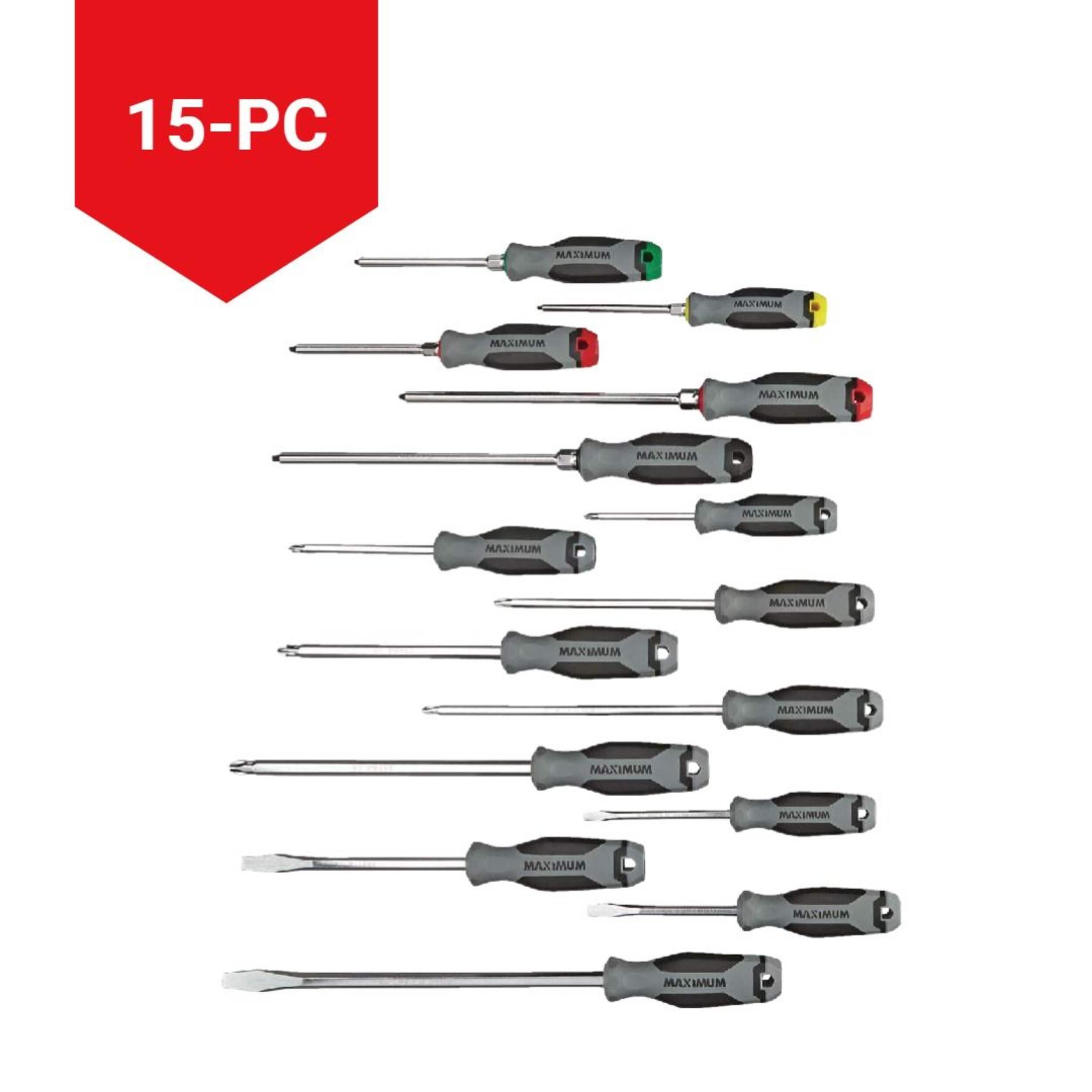 Agrandissez votre collection d'outils avec le jeu de tournevis MAXIMUM. Les outils de ce jeu de tournevis durables sont dotés d'un manche en composite qui offre une prise coussinée pour plus de confort, ainsi qu'un couple et un contrôle améliorés. Cet ensemble de 15 pièces comprend un tournevis cruciforme, un tournevis carré et un tournevis plat. Grâce à sa garantie d'échange à vie, cet ensemble d'outils offre une longue durée de vie et une grande valeur.