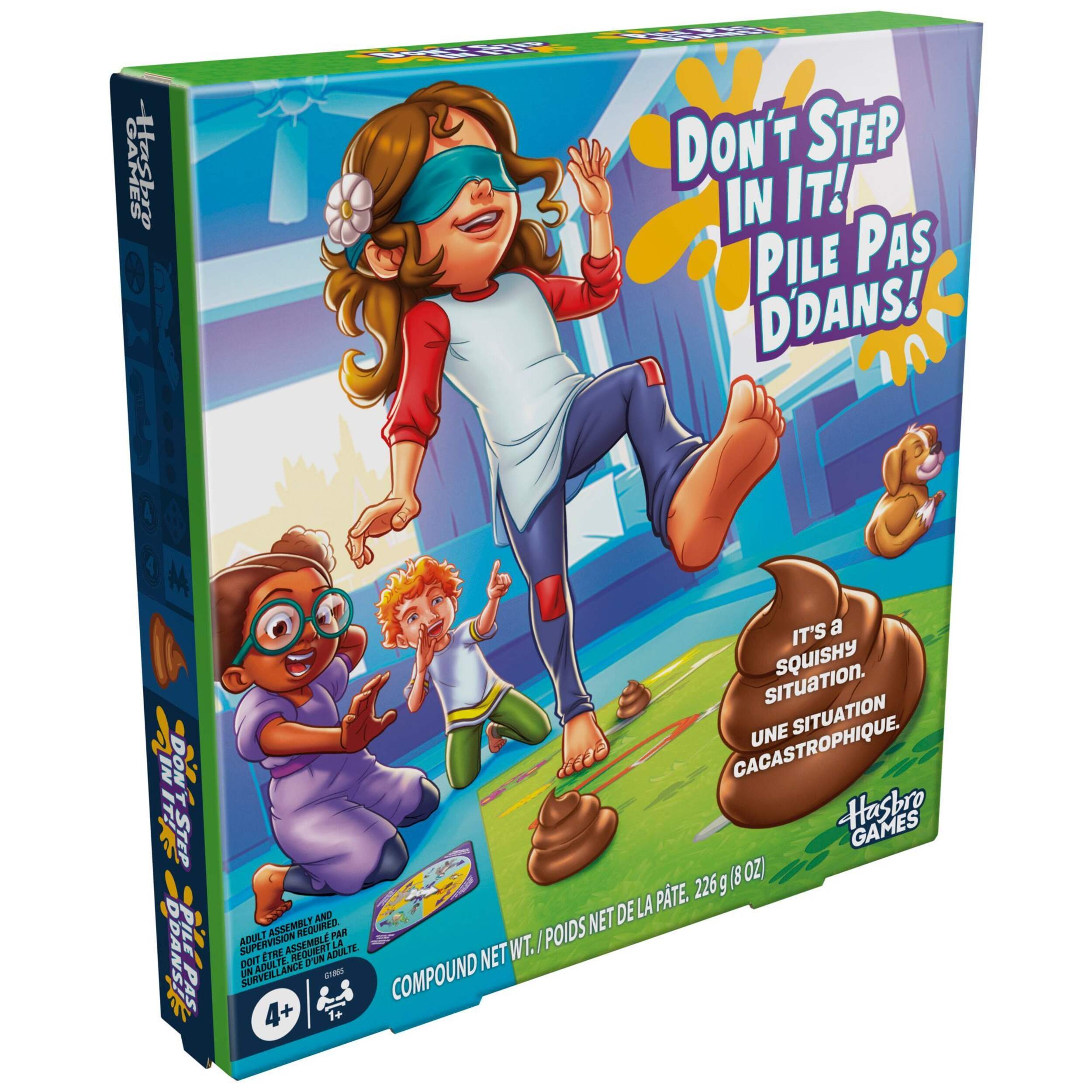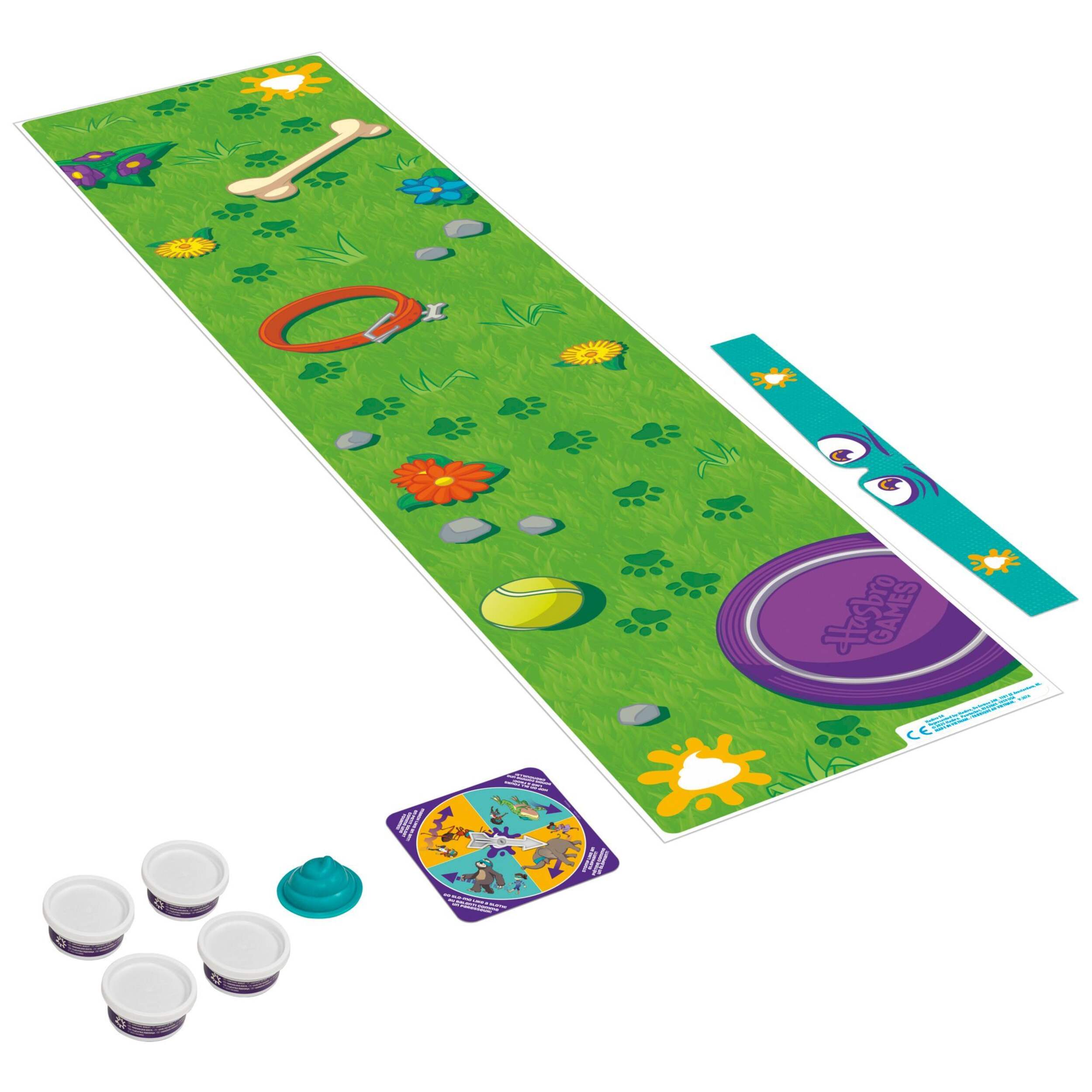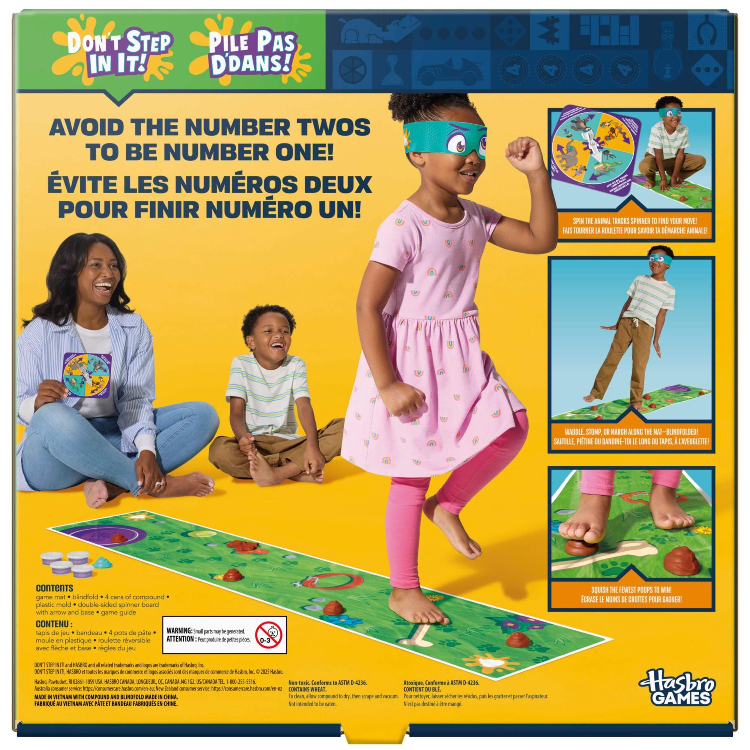 C'est une situation délicate. Dans le jeu Don't Step in It!, les enfants doivent éviter de marcher dans les crottes tout en se déplaçant comme un animal sur le tapis, et ce, les yeux bandés! Un joueur fait tourner la flèche tournante de la piste d'animaux pour choisir l'un des 8 mouvements d'animaux, comme sauter comme une grenouille ou piétiner comme un éléphant. Ensuite, ils mettent le bandeau et traversent le tapis de jeu en imitant les mouvements de cet animal. Mais attention! De petits tas de mélange, moulés en forme de crottes, ont été stratégiquement placés sur le tapis. Qui peut esquiver le plus d'excréments pour gagner? Que vous recherchiez des jeux amusants pour les fêtes d'enfants ou des jeux familiaux divertissants pour les enfants de 4 ans et plus, ce jeu d'intérieur pour enfants et adultes vous garantit des moments hilarants! Les jeux actifs préscolaires et les jeux de société constituent d'excellents cadeaux pour les fêtes et les anniversaires des enfants âgés de 4 ans et plus. Don't Step in It! et Hasbro ainsi que tous les marques commerciales et logos associés sont des marques commerciales de Hasbro, Inc. Il comprend un tapis de jeu, un bandeau pour les yeux, 4 pots de mélange, un moule en plastique, une planche tournante double face avec flèche et socle, et un guide de jeu. Pour les enfants de 4 ans et plus. Pour 1 joueur ou plus.