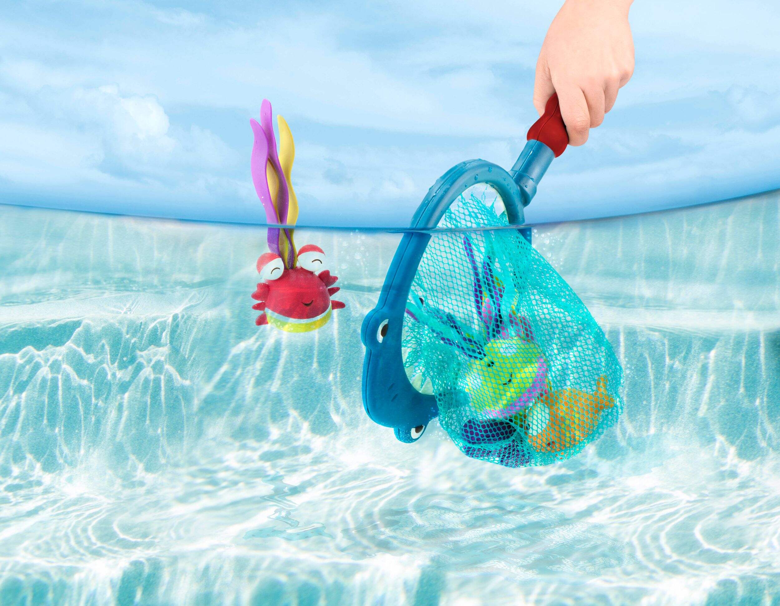 4 accessoires lestés : regardez-les couler dans la piscine, puis plongez et attrapez-les avec le filet facile à tenir