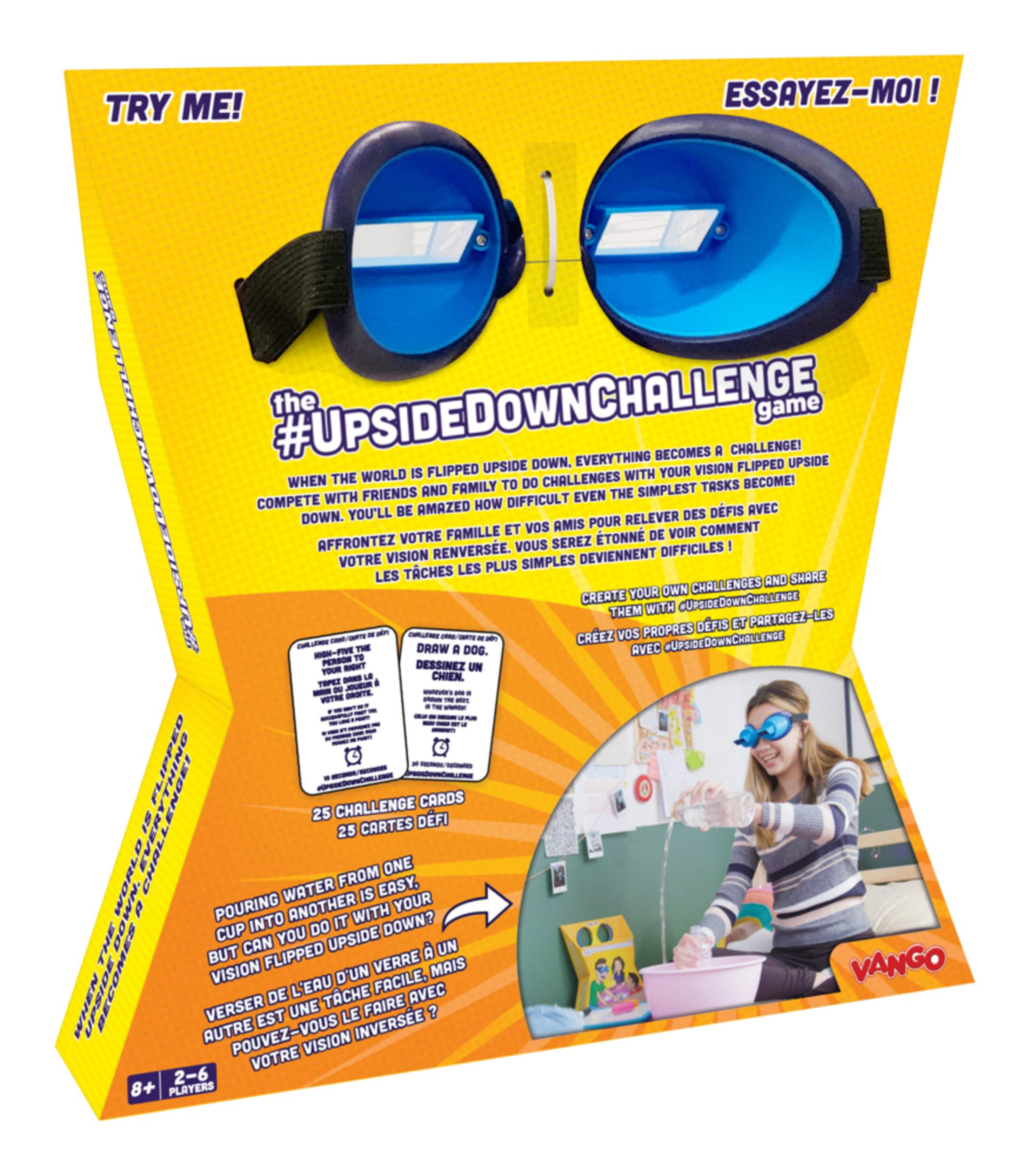 Des soirées jeux hilarantes! Le jeu The #UpsideDownChallenge fera rire votre famille et vos amis durant des heures. Réalisez de simples actions comme écrire votre nom, taper dans la main ou vider un gobelet d'eau dans un autre, en voyant le monde à l'envers. C'est bien plus difficile que vous le croyez.