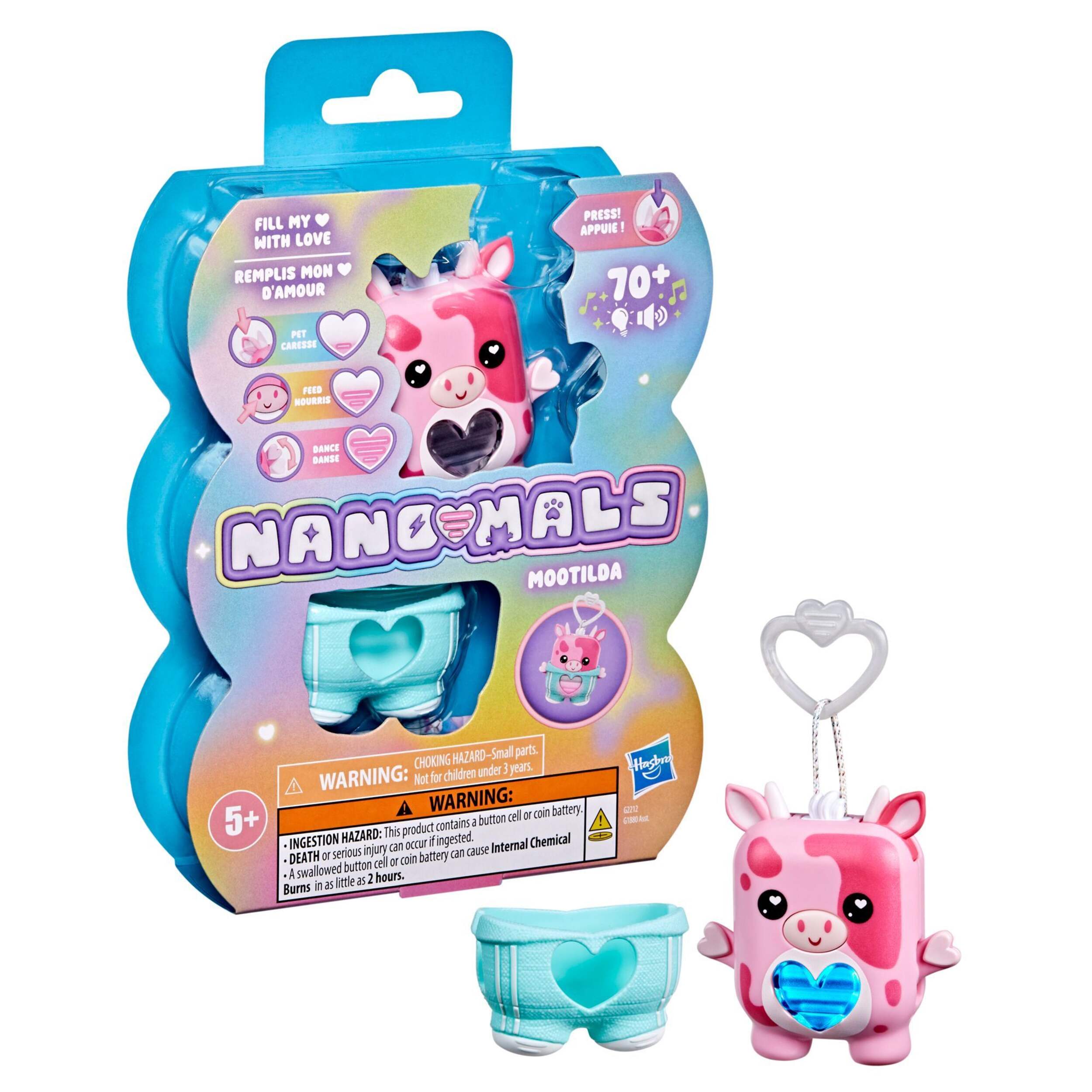Débloquez un monde d'animaux de poche à la mode et agités avec les Nano-mals! Les Nano-mals sont des jouets sensoriels électroniques et de petits compagnons adorables qui ont besoin de votre amour! Chaque personnage Nano-mals est doté d'un cardiomètre qui change de couleur que les enfants peuvent remplir de nombreuses façons amusantes et satisfaisantes. Lorsque leur cardiomètre s'abaisse, ils émettent des sons pour vous indiquer qu'ils ont besoin de soins. Si leur cardiomètre est bleu, ils ont besoin d'être caressés, alors appuyez sur leurs oreilles. Si leur cœur est orange, ils ont faim, appuyez sur leur bouche pour faire semblant de les nourrir. Leur cœur est-il rose? Cliquez leurs bras vers le haut et vers le bas pour les faire danser. Qu'en est-il du violet? Ils veulent bouger! Retournez, attrapez ou secouez pour remplir leur cœur. Votre Nano-mal célébrera lorsque son cœur est plein avec une chanson et un spectacle de lumière colorée. Donnez-leur une touche de style supplémentaire avec une tenue texturée enclipsable. De plus, ils sont dotés d'une pince, ils peuvent donc être utilisés comme porte-clés pour enfants. Les Nano-mals sont le cadeau idéal pour les enfants qui aiment les jouets d'animaux, les animaux numériques et les jouets à manipuler. Nano-mals et Hasbro, toutes les marques de commerce et tous les logos associés sont des marques de commerce de Hasbro, inc.