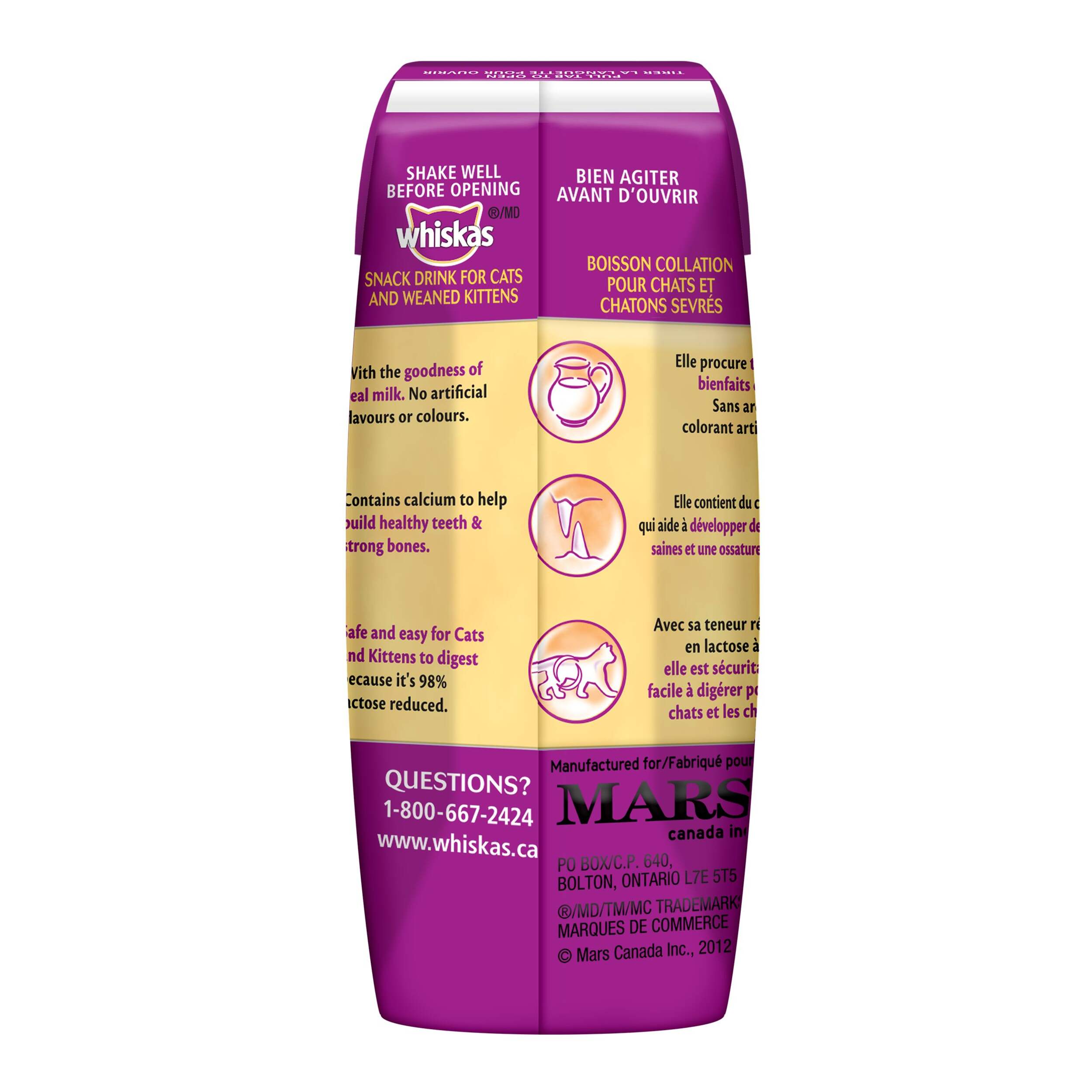 Chats et chatons qui adorent le lait, mais la plupart des chats ne peuvent pas avoir de lait ordinaire parce qu'il est difficile à digérer. C'est pourquoi nous avons mis au point le lait pour chats WHISKAS MD CATMILK MC , un produit laitier naturel spécialement formulé avec une teneur en lactose réduite à 98 %, pour servir même aux chats les plus sensibles le goût qu'ils aiment sans inquiétude pour leur digestion. WHISKAS MD CATMILK MC conserve tous les bienfaits du lait, est enrichi d'éléments nutritifs essentiels et est naturellement riche en calcium pour promouvoir la santé des dents et des os. Vous pouvez donc le servir à votre chat ou chaton en toute quiétude et à tout moment comme gâterie santé ou avec son repas régulier.