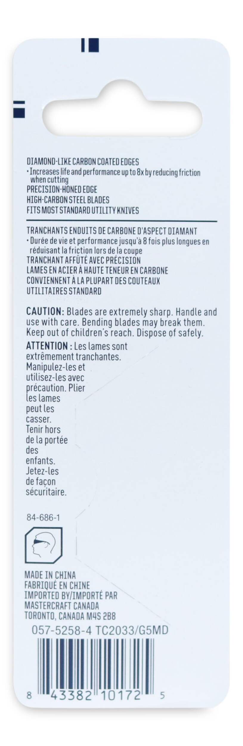 Les lames tout usage Mastercraft DLC, paq. 10, sont idéales pour équiper votre couteau à lame rétractable pour de nombreuses tâches. Chaque lame de remplacement pour couteau tout usage est dotée d'un tranchant enduit au carbone, semblable à du diamant, qui augmente la durée de vie et le rendement jusqu'à 8 fois en réduisant la friction lors de la coupe. L'acier à forte teneur en carbone confère qualité et résistance à ces lames de remplacement pour couteaux à lame rétractable. Ces lames sont dotées d'un tranchant aiguisé avec précision et conviennent à un couteau à lame rétractable standard ainsi qu'à la plupart des couteaux tout usage. Le paquet comprend 10 pièces.