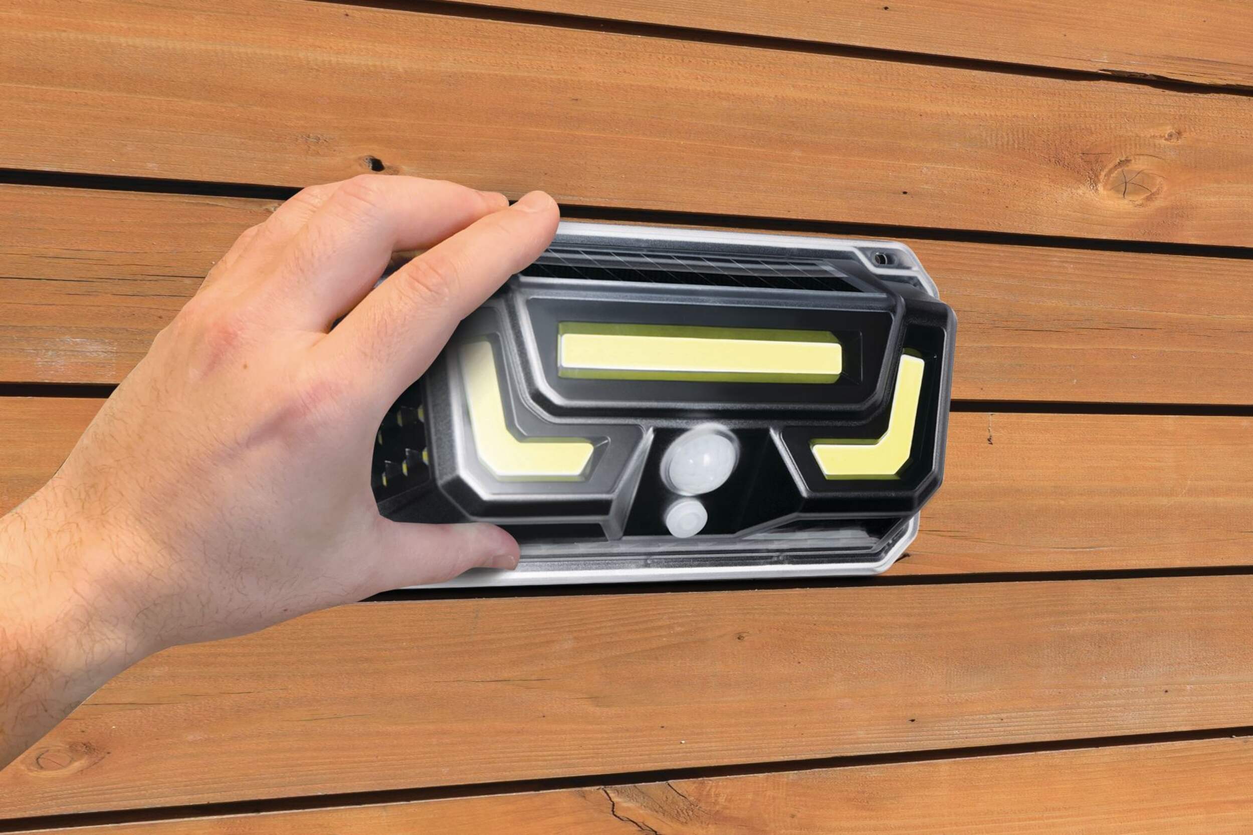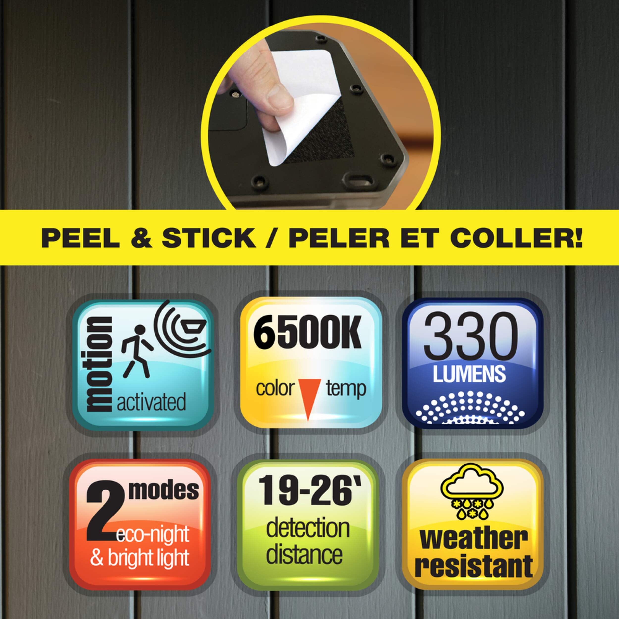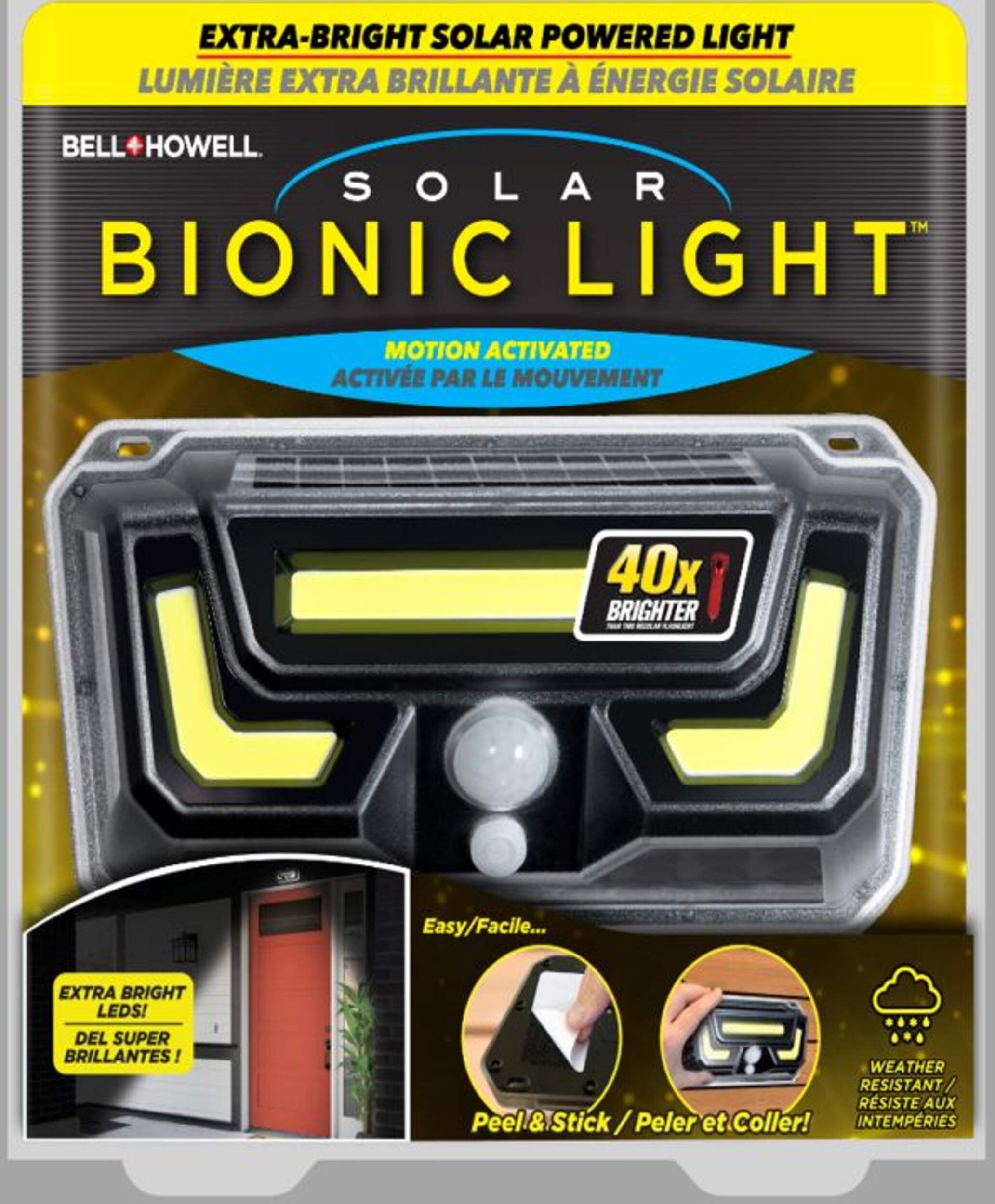 Profitez d'un éclairage extérieur mains libres lorsque vous en avez le plus besoin avec la lampe solaire bionique Bell + Howell, comme à la télé. Ce luminaire sans fil utilisant l'énergie solaire stockée pendant la journée pour faire fonctionner ses 50 ampoules à DEL, offrant 40 fois la luminosité des lampes solaires ordinaires. Détecteur de mouvement activant automatiquement la lumière écologique lorsqu'un mouvement est détecté à une distance allant jusqu'à 26 pieds, éclairant les allées, les escaliers et les autres zones pour un fonctionnement pratique mains libres. Fabriqué à partir de matériaux résistants aux intempéries, le support adhésif facilite l'installation sans outils ni besoin d'un électricien : il suffit de peler et coller.
