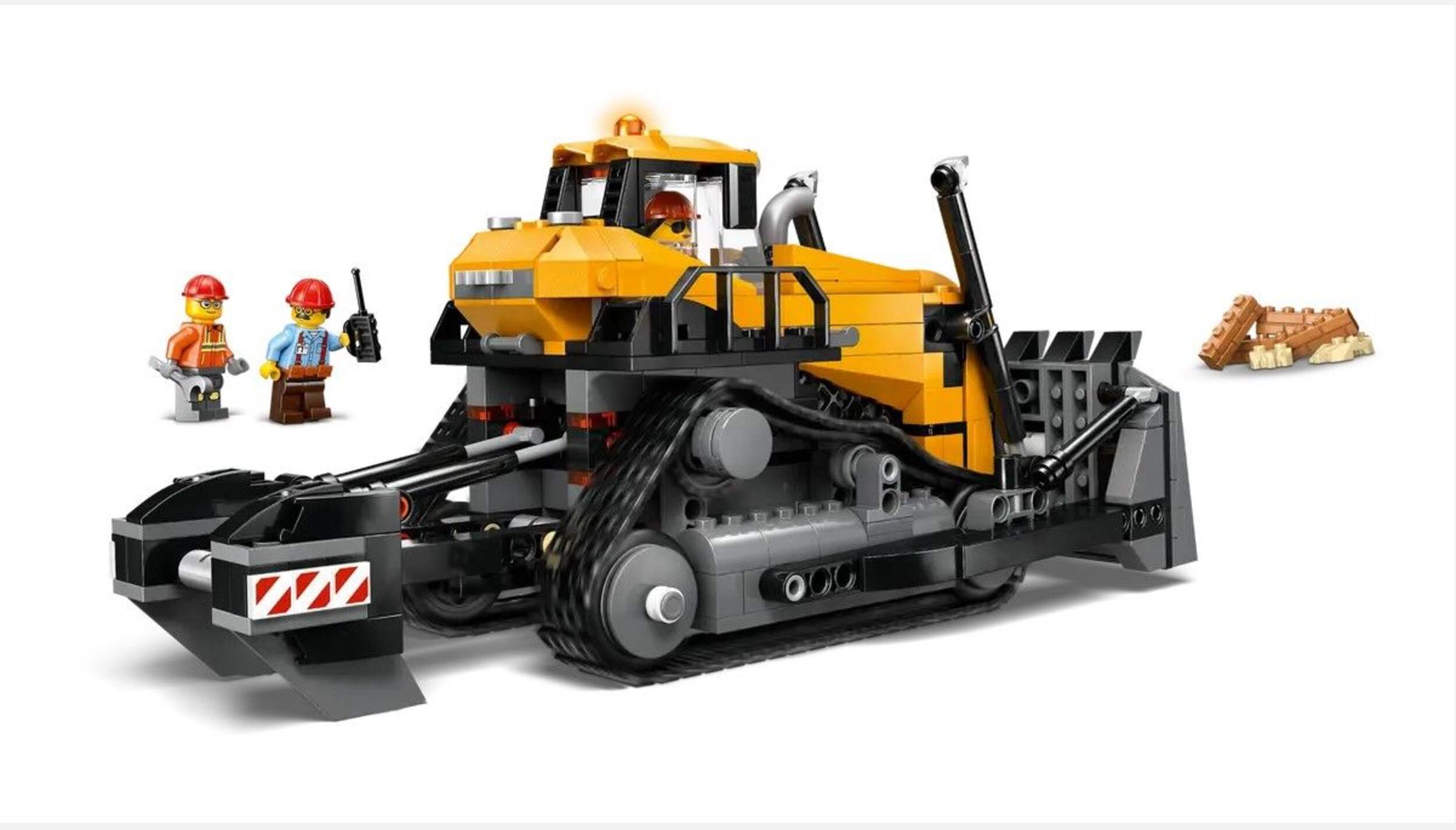 Comprend un puissant bulldozer avec des pièces de moteur mobiles, un panneau de construction pour la sécurité sur le chantier, ainsi qu'un chauffeur et 2 minifigurines de travailleurs de la construction