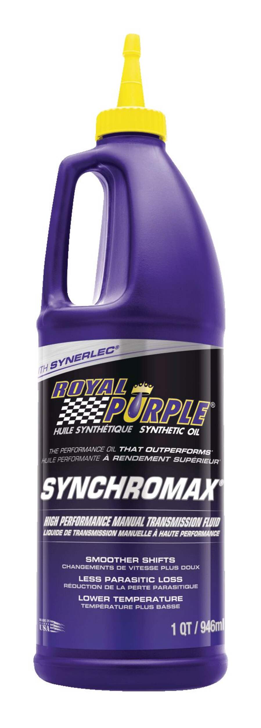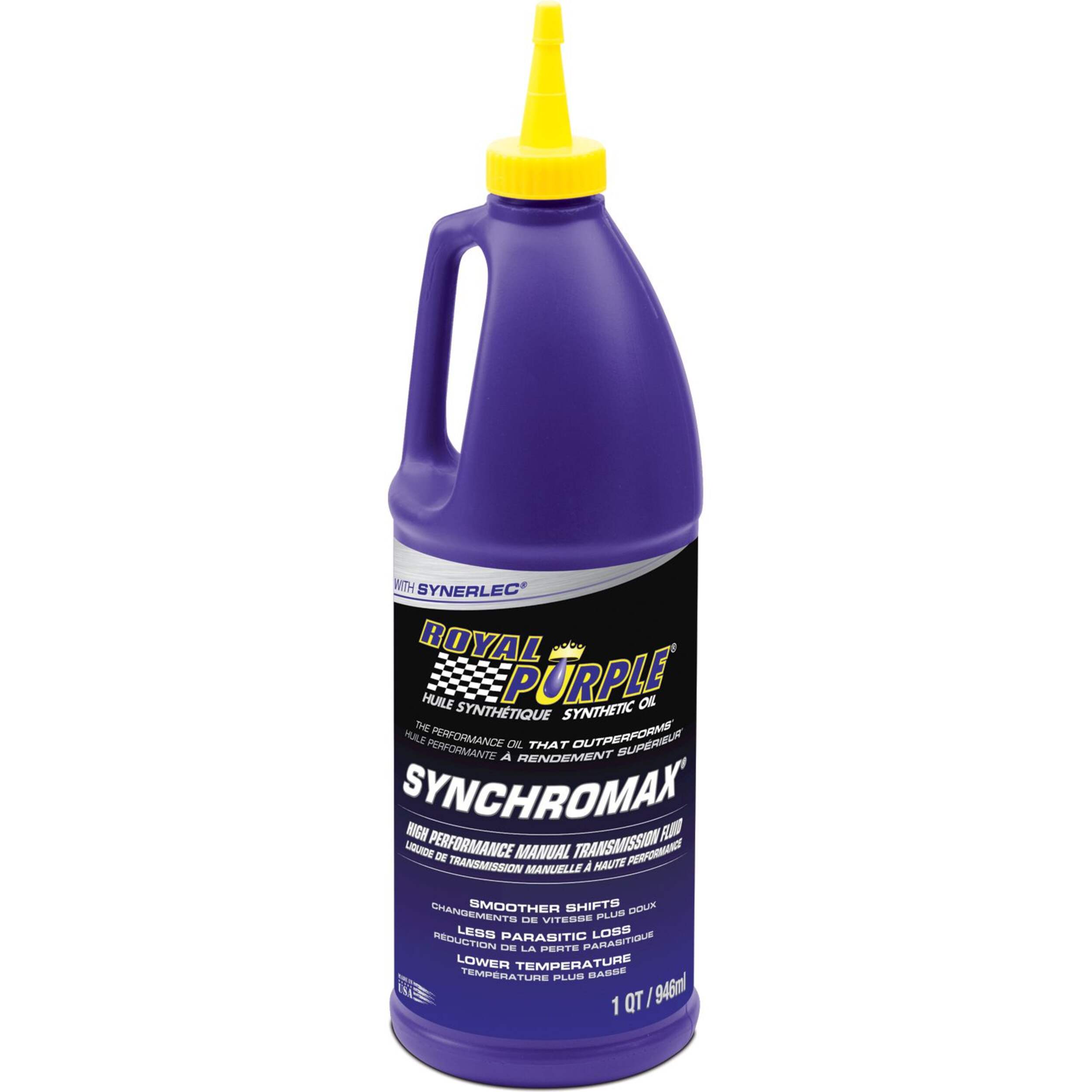 Le liquide Royal PurpleMD SynchromaxMD est recommandé pour les boîtes de vitesses manuelles qui demandent un liquide de boîte automatique ou une autre huile à faible viscosité. Il est également idéal pour les boîtes de transfert et les boîtes d'engrenages de moto à 2 temps qui demandent un lubrifiant à faible viscosité. Synchromax est formulé avec la technologie synthétique Synerlecadditive exclusive de Royal Purple, ce qui offre une meilleure qualité de changement de vitesse sur une vaste plage de températures et une réduction du bruit des engrenages. Synchromax est entièrement compatible avec tous les types de matériaux de friction et offre une excellente protection contre la corrosion et l'oxydation sans affecter les métaux mous que l'on retrouve couramment dans les synchroniseurs à boîte de vitesses manuelles.