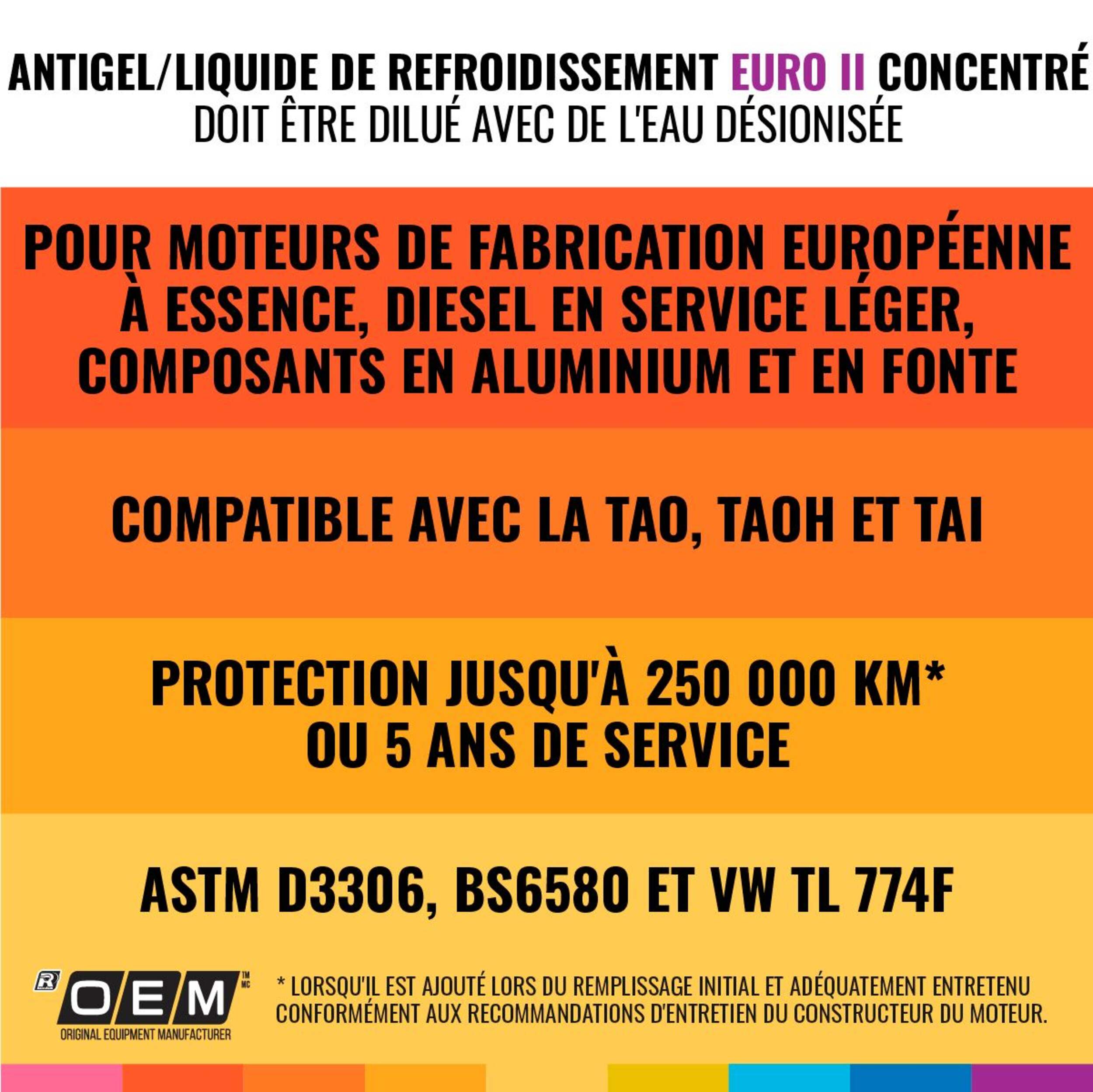 Liquide de refroidissement et antigel concentré du fabriquant d'origine Euro II faible en silicate et ne contient pas de nitrite, d'anime ni de phosphates (NAP). Formule à base d'éthylène glycol compatible avec d'autres produits similaires d'antigels et liquides de refroidissement HOAT/OAT à durée de vie prolongée. Pour de meilleurs résultats, ne pas mélanger avec les liquides de refroidissement conventionnels à pH élevé, à base de phosphore, de borate ou de silicate