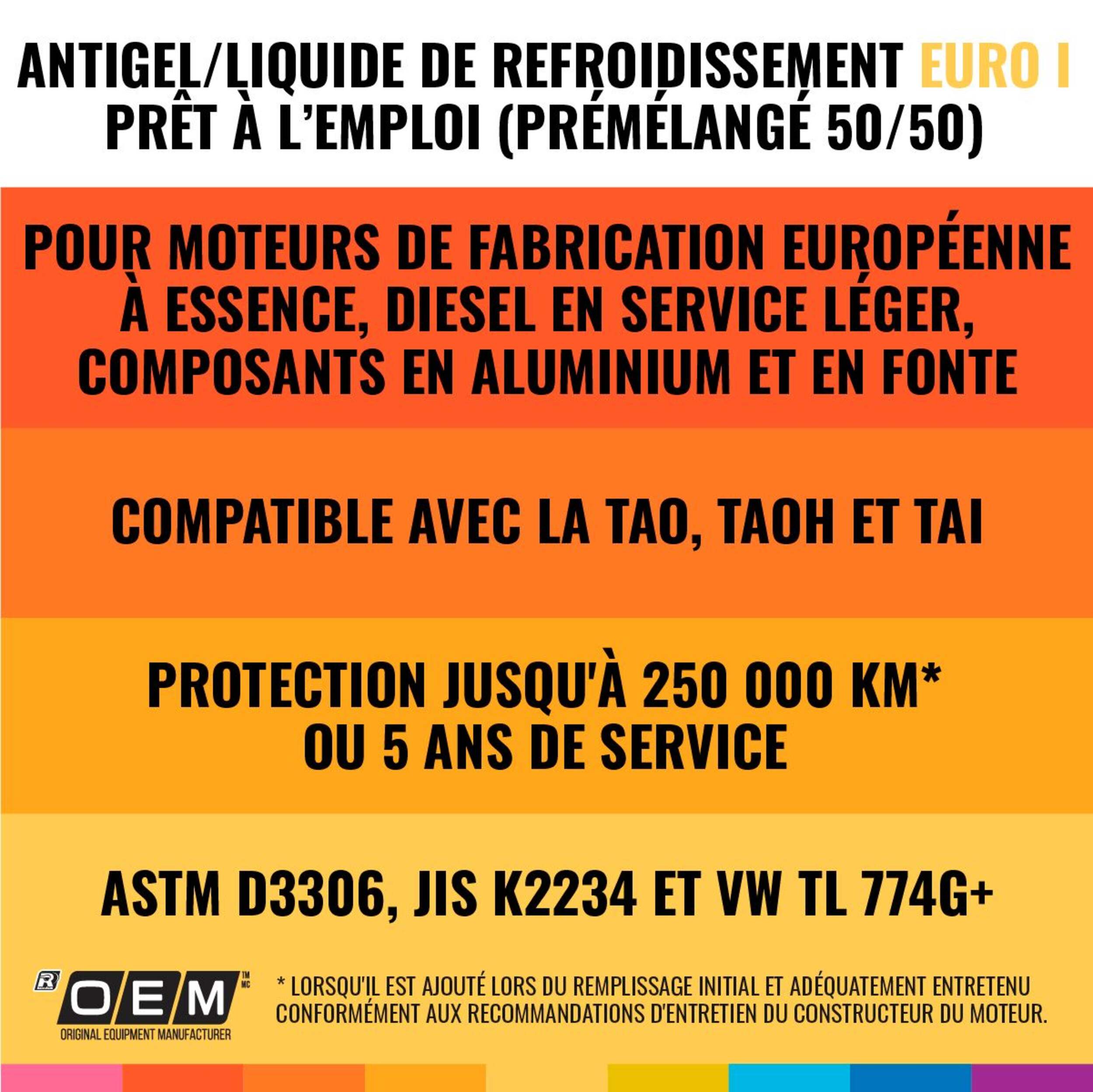 Antigel et liquide de refroidissement prêt à l'emploi du fabricant d'origine Euro I exempt de silicate, de borate, de nitrite, de nitrate, de phosphate et d'amine. Formule à base d'éthylène glycol compatible avec d'autres produits similaires d'antigels et liquides de refroidissement OAT à durée de vie prolongée. Pour de meilleurs résultats, ne pas mélanger avec les liquides de refroidissement conventionnels à pH élevé, à base de phosphore, de borate ou de silicate